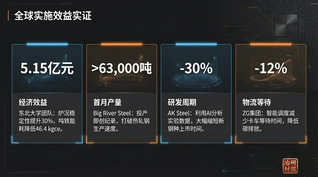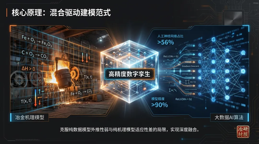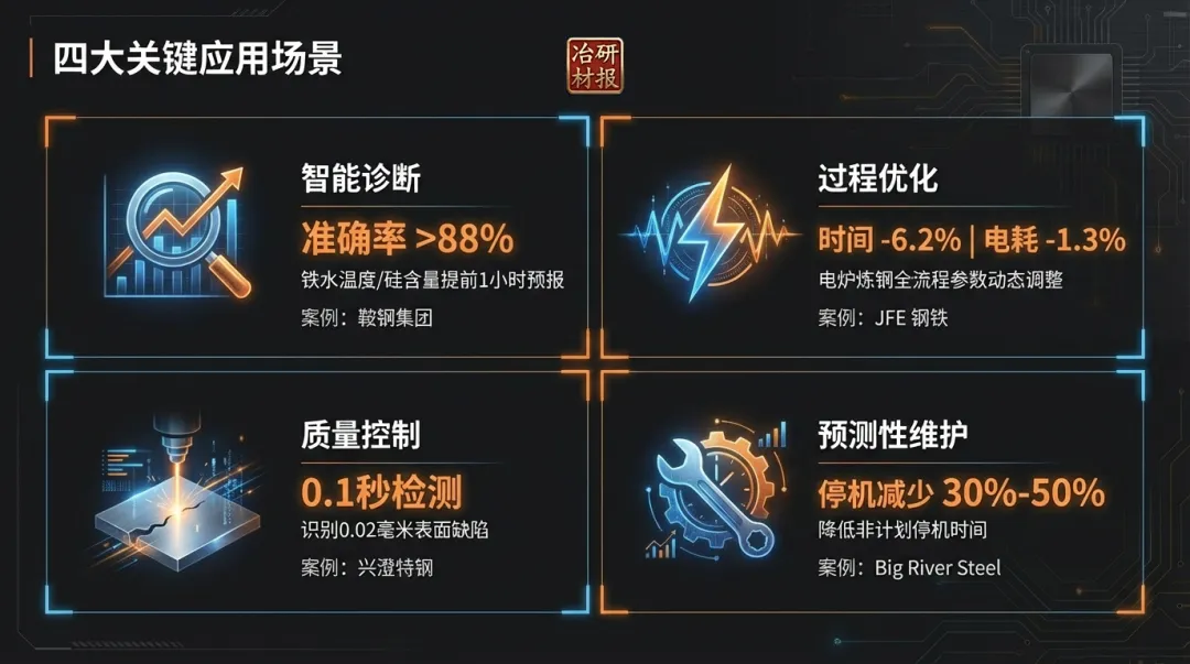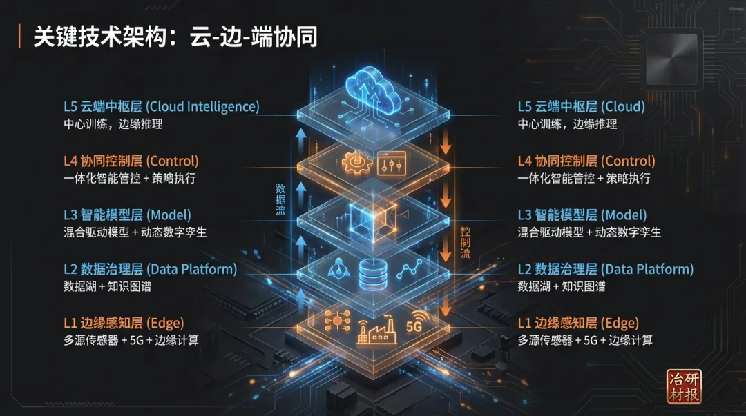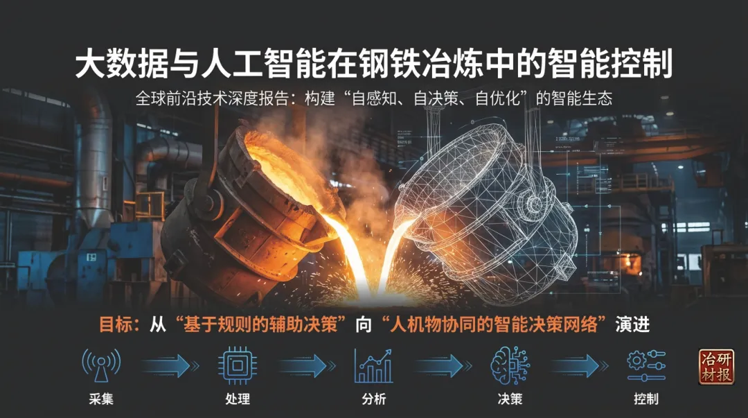 钢铁冶炼智能控制的核心目标是通过融合大数据、人工智能(AI)与冶金机理,实现生产过程的 “自感知、自决策、自优化” ,形成 人机物协同的智能决策网络 。其演进路径正从早期的信息化、基于规则的辅助决策,向具备自适应、自学习能力的高级智能化控制发展。智能控制系统依赖AI算法处理高维、耦合的冶炼过程数据,建立输入工艺参数与输出结果(如质量、能耗)之间复杂的非线性映射关系,并据此生成优化控制策略。机器学习算法体系:以 人工神经网络(特别是深度神经网络) 为主流,其应用在炼钢过程建模中占比超过56%,擅长处理高维非线性问题。同时,支持向量机、随机森林、极限学习机等也是重要的建模工具。强化学习则被用于训练智能体在数字孪生等虚拟环境中自主寻找最优操作策略。混合驱动建模范式:这是实现高精度控制的关键,其核心是深度融合冶金机理模型、专家经验规则与大数据驱动的AI算法。该范式克服了单一机理模型普适性差或纯数据模型外推性弱的缺点,使数字孪生模型精度普遍超过90%。炉况智能诊断与预测:整合高炉全流程多源异构数据,构建高精度动态数字孪生系统,能够预测铁水温度、硅含量、炉缸活跃性、煤气利用率等核心指标。例如,鞍钢集团的应用可实现关键指标提前1小时预报,准确率88%以上。能耗优化:AI模型可实时动态调整高炉、转炉、电弧炉等关键设备的操作参数。ArcelorMittal和SSAB通过优化高炉和电弧炉操作,分别实现能耗降低约5%和7%。JFE钢铁优化电炉供电模式,缩短炼钢时间6.2%,降低电耗1.3%。闭环控制:基于模型预测控制(MPC)和专家系统,实现高炉炉温、煤气流、炉渣碱度等关键工艺参数的自动闭环控制,管控率可达90%-100%。在线质量控制与缺陷检测:应用机器视觉与深度学习模型(如CNN),对连铸坯、热轧钢材进行在线表面质量检测。例如,兴澄特钢的AI系统可检测0.02毫米的缺陷,耗时仅0.1秒;首钢的钢板缺陷分类模型准确率达99.98%。设备预测性维护:基于温度、振动等传感器数据,利用时间序列分析与异常检测算法预测设备故障。美国大河钢铁(Big River Steel)的应用使非计划停机时间减少30%-50%;其与谷歌云合作的生成式AI系统,预计能将维护工单完成时间缩短约20%。现代钢铁冶炼智能控制系统普遍采用“云-边-端”协同的扁平化架构 ,实现数据的全域流通与智能决策的敏捷响应。架构的运行逻辑 遵循 “采集-处理-分析-决策-控制” 的闭环。现场数据经边缘层初步处理后,汇入大数据平台进行深度治理;治理后的数据驱动智能模型层的数字孪生系统进行实时仿真与预测;优化决策结果通过协同控制层转化为具体操作指令,最终作用于物理产线,形成智能调控闭环。当前,钢铁冶炼的智能化控制已从 单点技术突破 (如转炉终点预测)走向 全流程、端到端的集成优化 。然而,其深入发展仍面临挑战:高质量、结构化工业数据的获取与治理;AI模型与深厚冶金知识更深度地融合;应对生产过程的 动态性、时变性与多扰动性 ;以及提升模型在“可行域”边缘运行的可靠性。未来趋势将聚焦于: 可解释性AI 以增强模型可信度与操作员接受度;基于 联邦学习、持续学习 的模型自适应进化,以适应原料波动等变化;以及构建面向钢铁行业的 垂类大模型平台 ,降低AI应用门槛,赋能更广泛的智能场景,最终驱动生产向更高级的自主智能化演进。