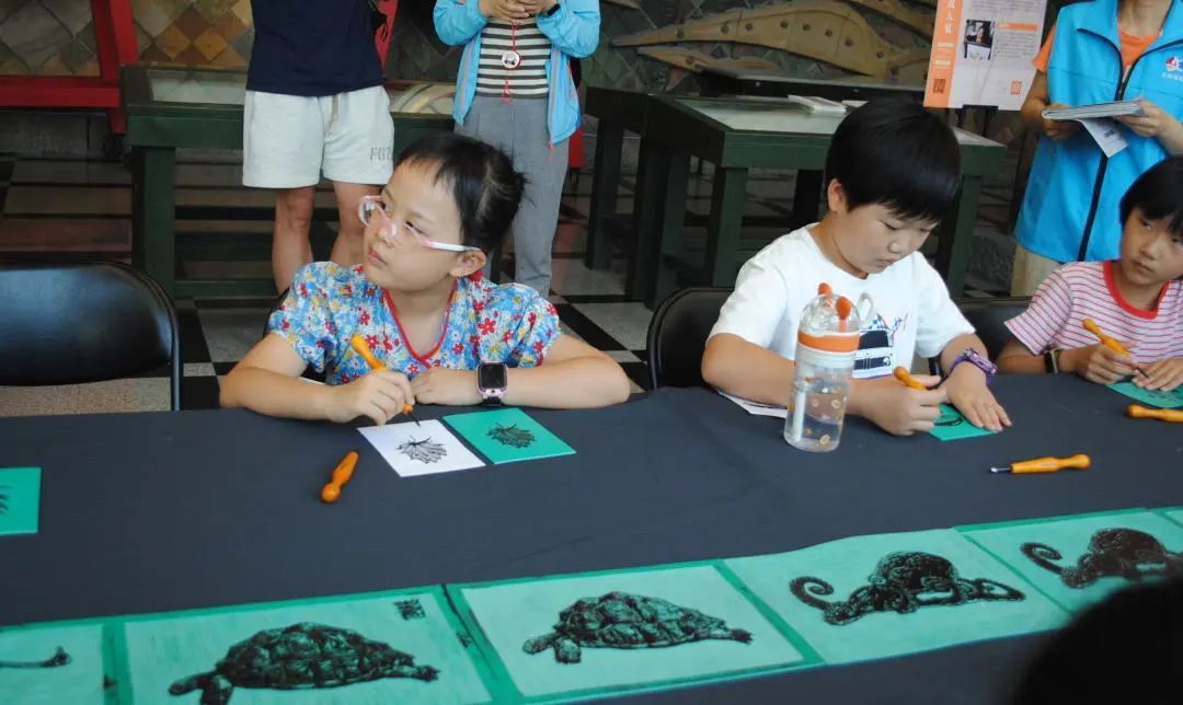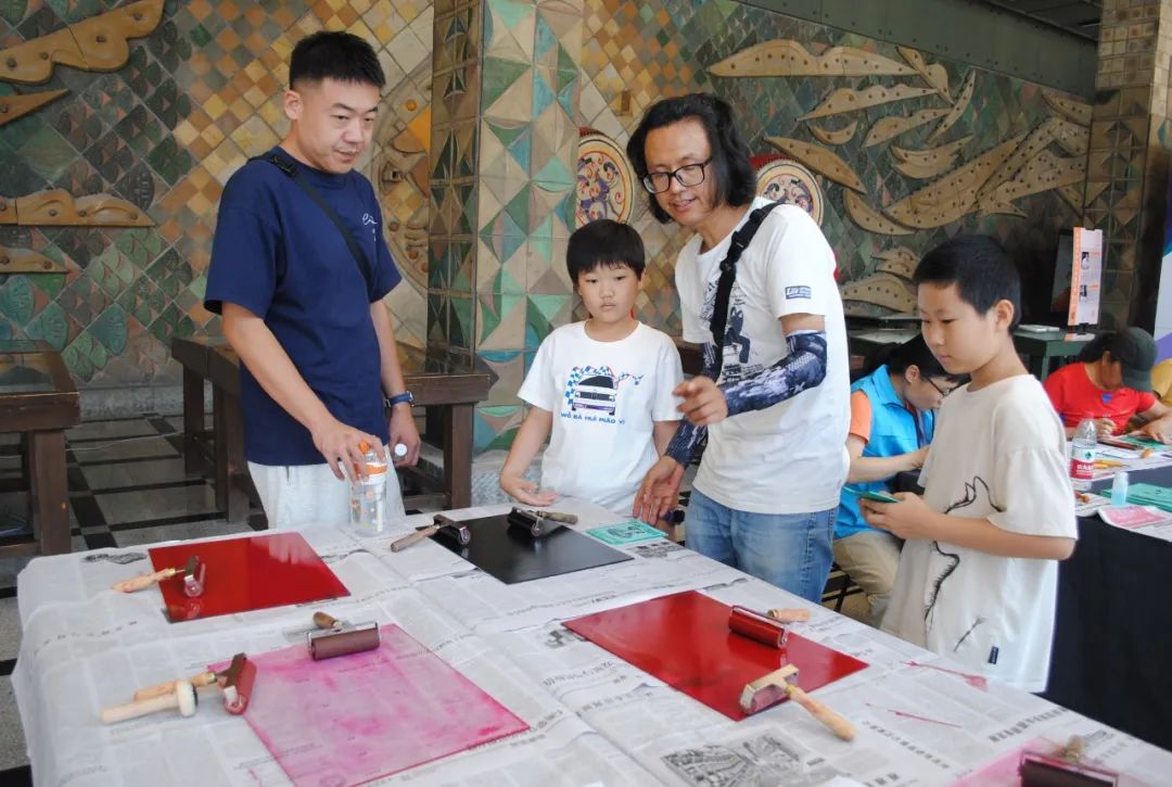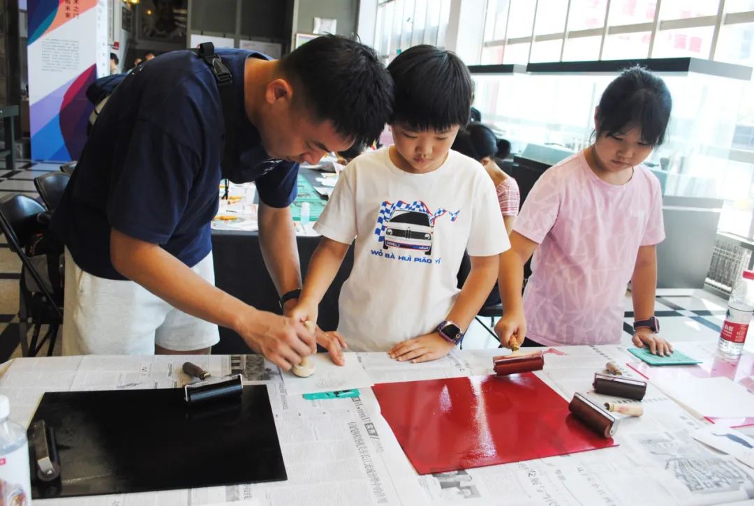8月19日上午,在朝阳区文化馆大厅的长条桌上,整齐地摆放着刻刀、胶版、专用拓印纸、墨台、油墨等,朝阳区宣传文化中心文化业务干部、毕业于南京艺术学院绘画专业的王海磊,和市民一起开启版画拓印实践审美体验之旅,带领大家现场感受版画艺术的魅力。