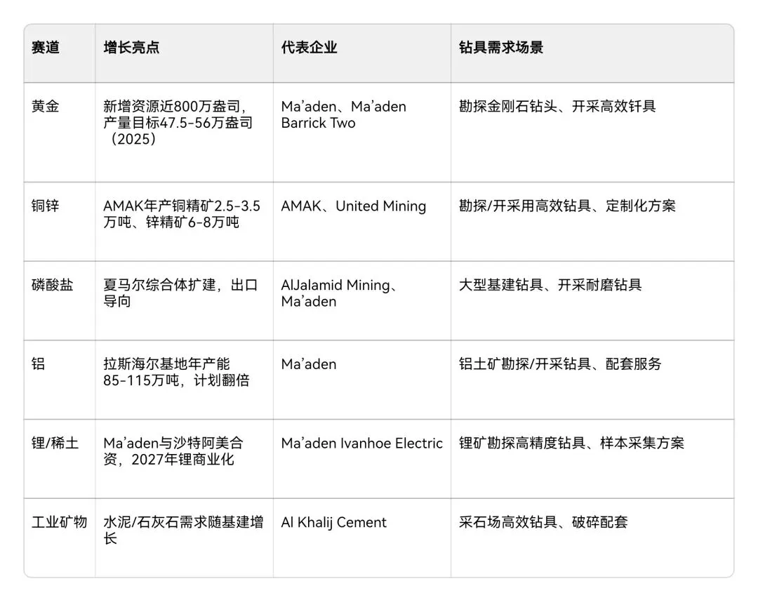 - Tier 3(潜力培育):Ma’aden Ivanhoe Electric(锂铜勘探)、Al Khalij Cement(基建采石)、Al Masar Minerals(多金属勘探)——长期需求、技术门槛高。