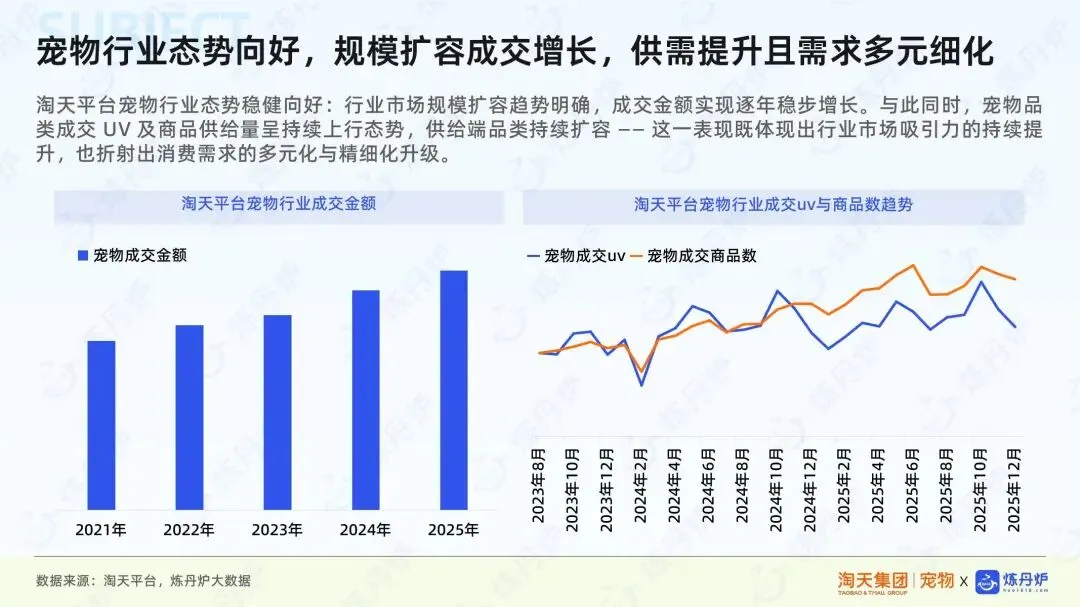 宠物行业呈稳健向好态势,市场规模持续扩容,成交金额逐年增长。商品供给量和成交UV持续上行,市场吸引力与消费需求多元化、精细化升级。商家新品上架节奏加快,平台通过流量扶持、曝光增加等措施,助力新品缩短冷启动周期。新品支付GMV持续攀升,显示市场交易规模扩大和消费者接受度提升。