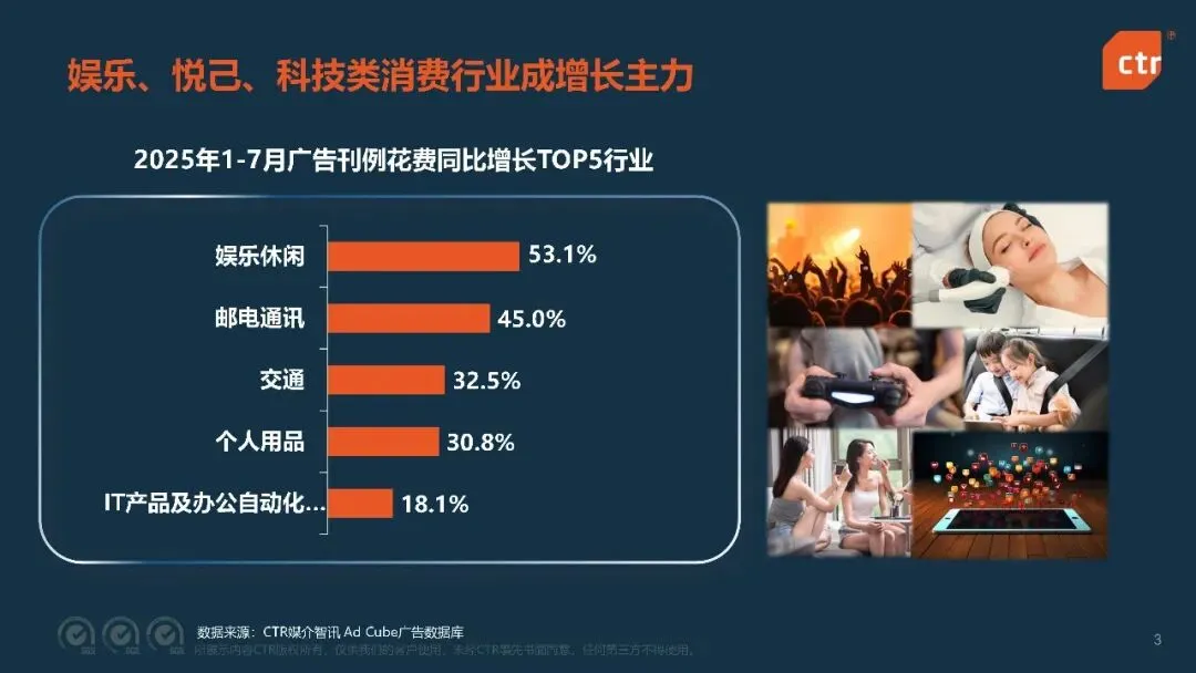 2025 年 1-7 月,广告市场增长动力强劲,娱乐、悦己、科技类消费行业成为核心增长引擎。其中娱乐休闲行业广告刊例花费同比增长 53.1%,邮电通讯行业紧随其后,增幅达 45.0%,交通、个人用品、IT 产品及办公自动化等行业也实现双位数增长,展现出强劲的市场需求。