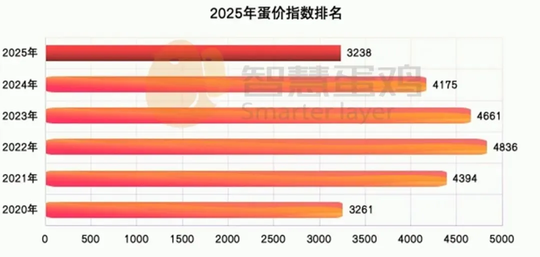 2025年度蛋价指数为3238点,居于2020-2025近六年间的最低位。