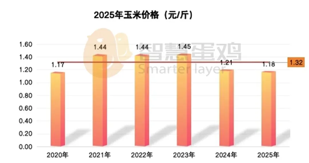 2025年度玉米均价1.18元/斤,比2024年度的1.21元/斤,下降了0.03元/斤,降幅为2.48%;较近六年玉米价格均值1.32元/斤,下降了0.14元/斤,降幅为10.61%。