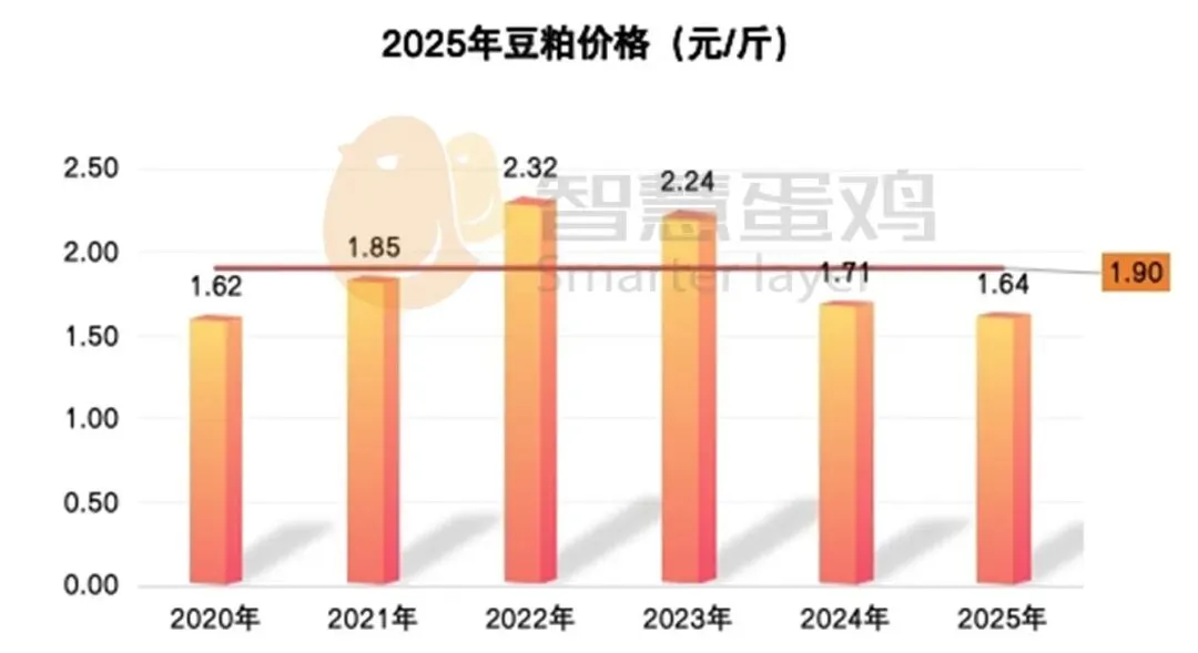 2025年度豆粕均价1.64元/斤,同比2024年度豆粕均价1.71元/斤,下降了0.07元/斤,降幅为4.09%;同比近六年豆粕价格均值1.90元/斤,下降了0.26元/斤,降幅为13.68%。
