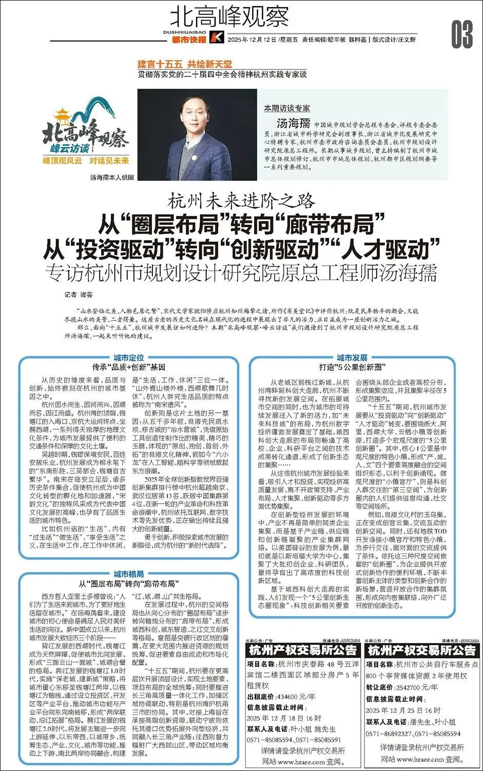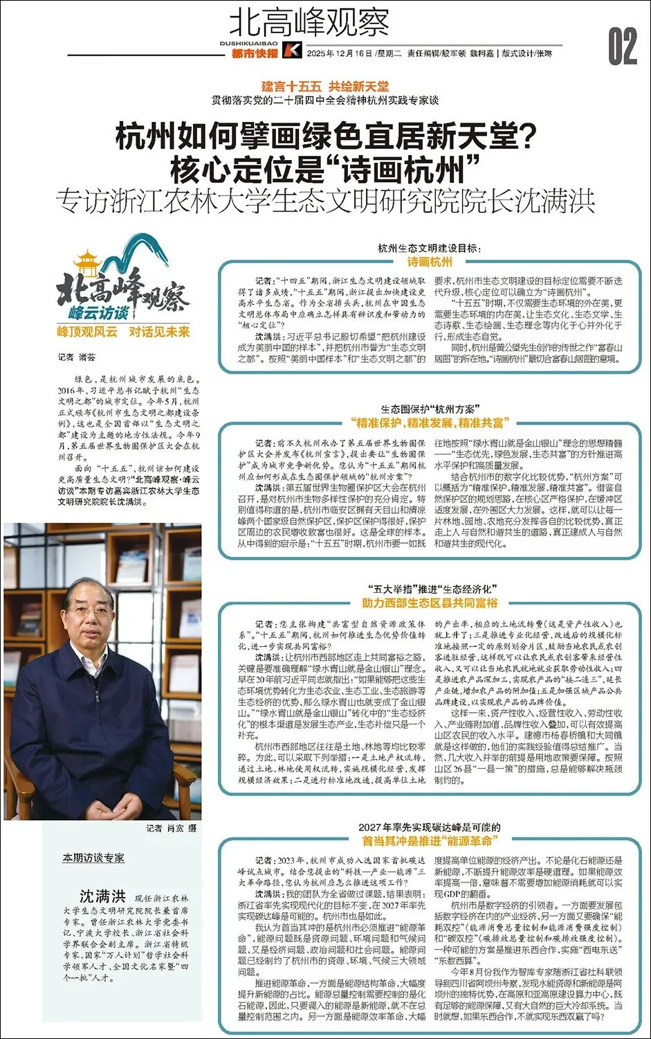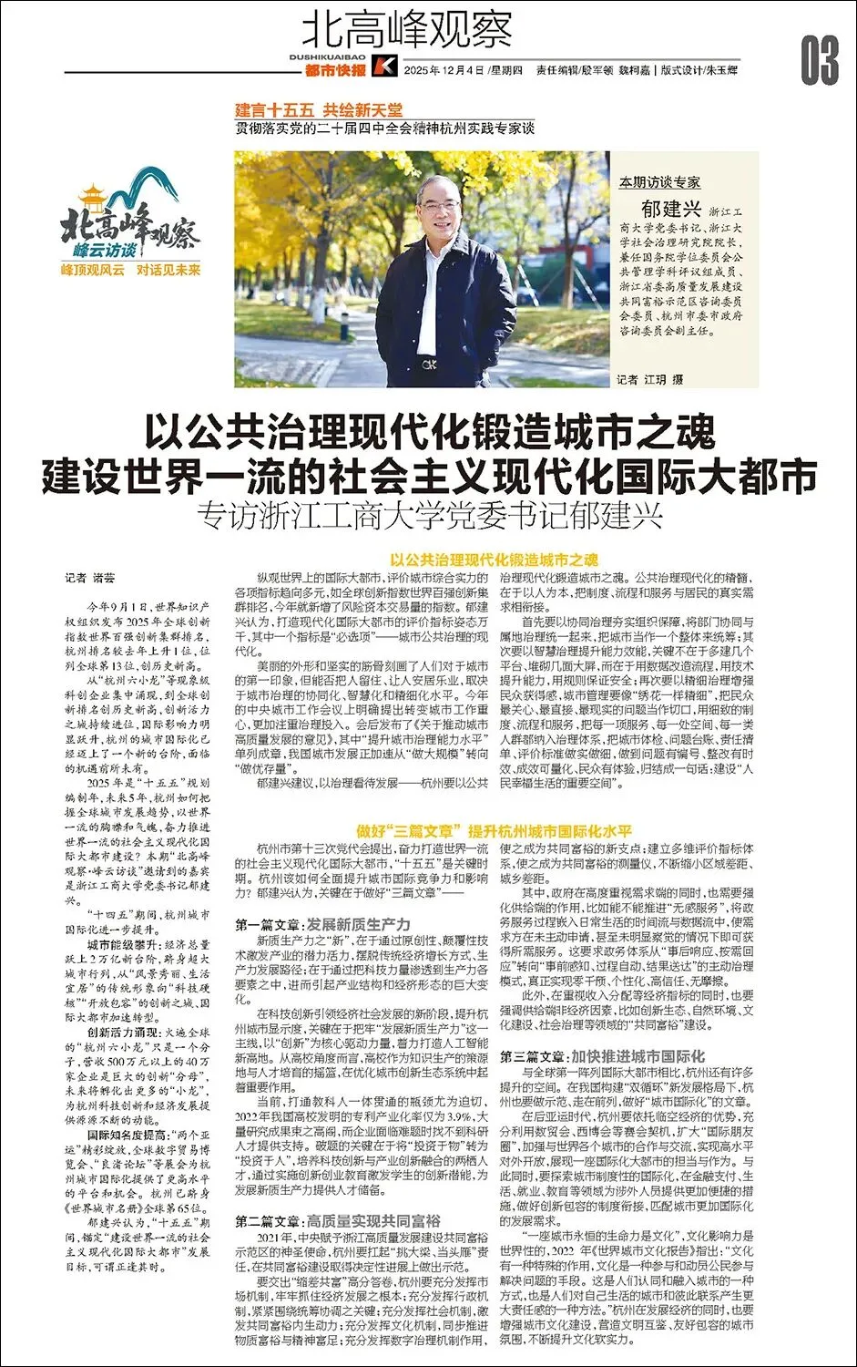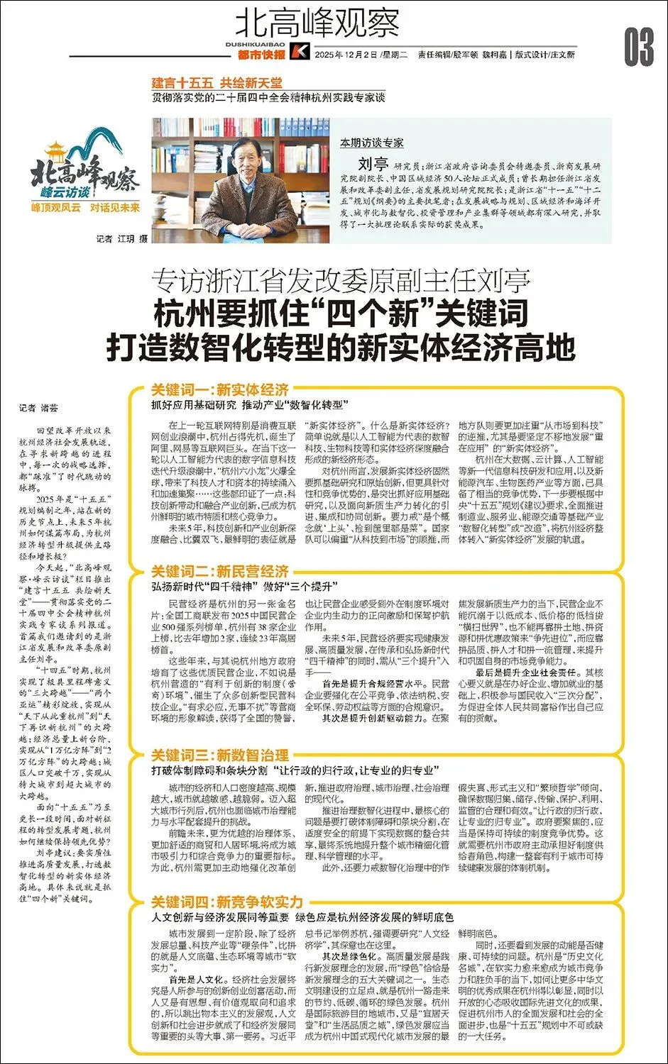 好的新闻报道,应该“有思想、有温度、有品质”——一头连着城市发展的脉搏,一头系着老百姓的期盼。作为都市快报时政新闻中心“北高峰观察·峰云访谈”栏目记者,我参与了“建言十五五 共绘新天堂” ——贯彻落实党的二十届四中全会精神杭州实践专家谈系列报道,更真切地感受到:把宏大的城市规划议题,变成可触摸、可探讨的公共话题,连接政府的战略考量、专家智慧和百姓心声,在理论和实践相结合的层面碰撞出城市前行的“火花”,正是融媒体时代时政报道打好“深度牌”的价值所在。