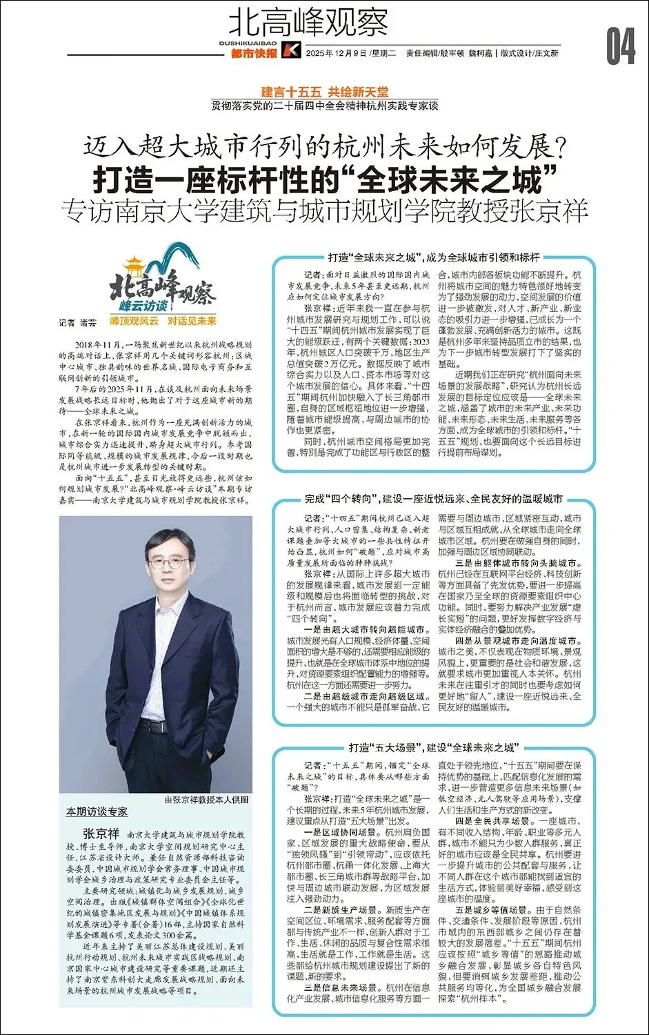 深度报道不能“掉书袋”。再深刻的观点,若裹在专业术语里,也很难被大众接受。因此要用具体的场景、老百姓熟悉的话题,把抽象的观点“融”进去。比如张京祥教授提出“打造全球未来之城”(《打造“全球未来之城”,杭州需要完成“四个转向”》),这个概念听起来很宏大。通过访谈,把这个概念拆解成“区域协同”“新质生产”“信息未来”“全民共享”“城乡等值”等五个具体场景,再结合杭州的低空经济、无人驾驶试点等实际案例,告诉读者“全球未来之城”并不遥远,而是和我们的工作、生活息息相关——比如未来可能出现的无人驾驶通勤、更便捷的跨城出行,都是这个目标里的一部分。