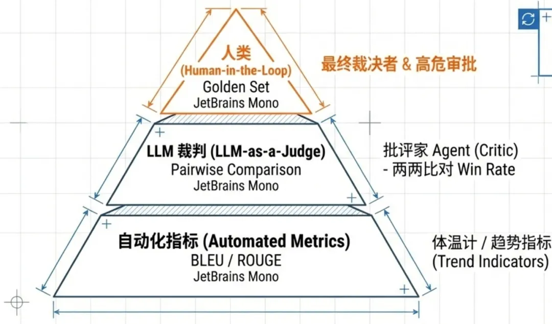 - 自动化指标:其角色定位是“体温计”。传统指标(如 ROUGE、BLEU Score)虽然无法理解复杂逻辑,但运行速度快、成本极低,最适合用作回归测试中的趋势指标。如果新版本的模型在这些指标上突然暴跌,这便是一个强烈的“系统发烧”信号。