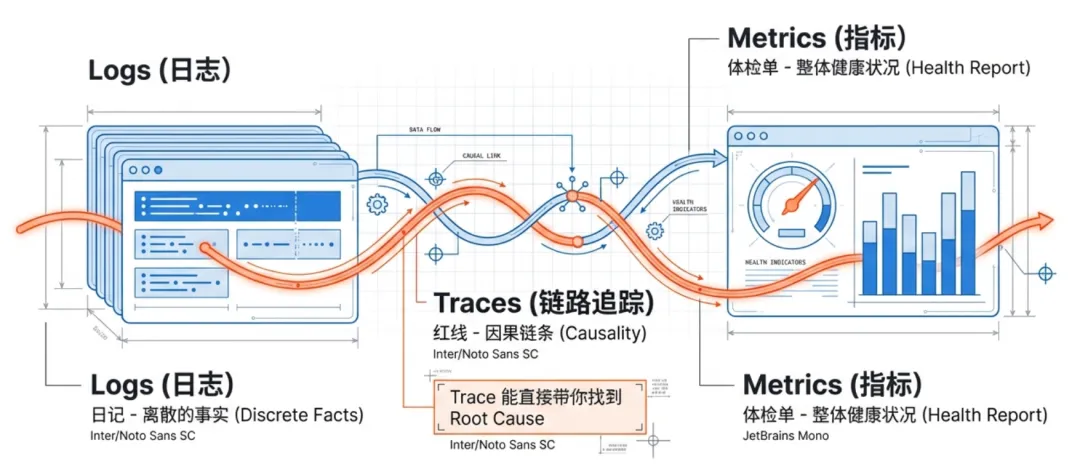 要实现真正的可观测性,我们需要掌握可观测性的三大技术支柱:日志 、链路追踪和指标。