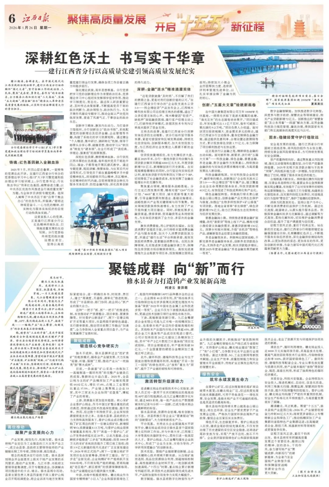 今天,《江西日报》第六版以半个版面篇幅,刊发题为《聚链成群 向“新”而行》的深度报道,系统聚焦修水县近年来推动钨产业链高质量发展的实践路径与成效,其中对我公司的相关介绍占据较大篇幅。
