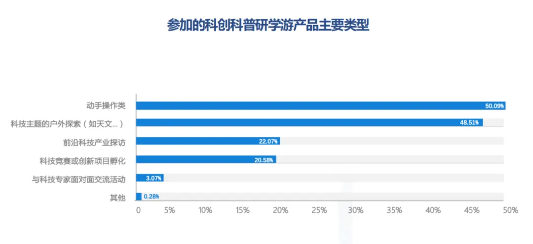 课程类型选择上,需求端呈现明确的实践导向特征。动手操作类、田野实践类科技研学产品成为市场主流,而“前沿科技产业探访”类产品展现出强劲的增长潜力。值得注意的是,未参与过科创科普研学的家庭群体,对“前沿科技产业探访”类产品的偏好度更高,构成此类产品的核心潜在客群。