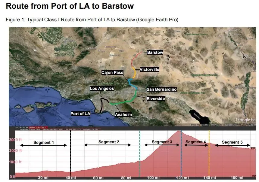 洛杉矶港至巴斯托段线路全长约 174 英里(约 280 公里),海拔最低 17 英尺(约 5.2 米),最高 3800 英尺(约 1158.2 米)。基于海拔变化差异,线路被划分为 5 个区段,涵盖平路、上坡及下坡路段,其中第 3 区段坡度最陡,第 4-5 区段为下坡路段。