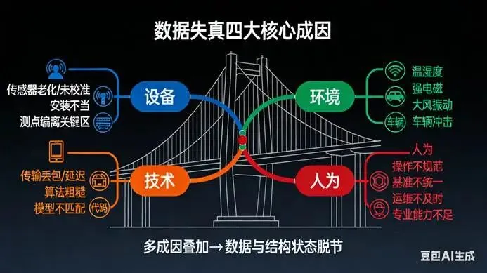 数据传输链路存在丢包、延迟、信号中断,算法设计粗糙缺乏去噪与融合能力,力学模型与桥梁实际工况不匹配,会让数据在传输、处理、解读阶段持续失真;