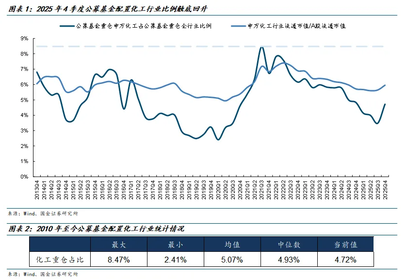 2025年4季度公募基金配置化工行业的市值占比呈现底部反转的趋势。复盘公募基金对化工行业的配置情况可以看出:2017年起化工行业配置从低配趋向超低配,2020年1季度受行业需求影响,公募基金重仓申万化工占公募基金重仓全行业比例跌至近十年历史最低点2.4%,2020年2季度开始随下游需求回暖带动化工配置持续提升,并连续一年呈现出持续提升的状态,2021年3季度公募基金继续加仓化工行业后重仓化工行业占比环比提升2.2pct至8.5%,达到了2010年以来公募基金重仓化工行业的最高值,2021年4季度在部分公募基金调仓减仓的背景下,重仓化工行业的占比环比下滑1.8pct至6.7%,2022年1季度公募基金配置化工比例阶段性回升至7.8%,从2022年2季度开始公募基金配置化工比例呈现出持续下滑的趋势,重仓化工行业市值占比在2025年3季度降低至3.5%,回落到历史相对低位状态,2025年4季度环比提升1.2pct至4.7%。