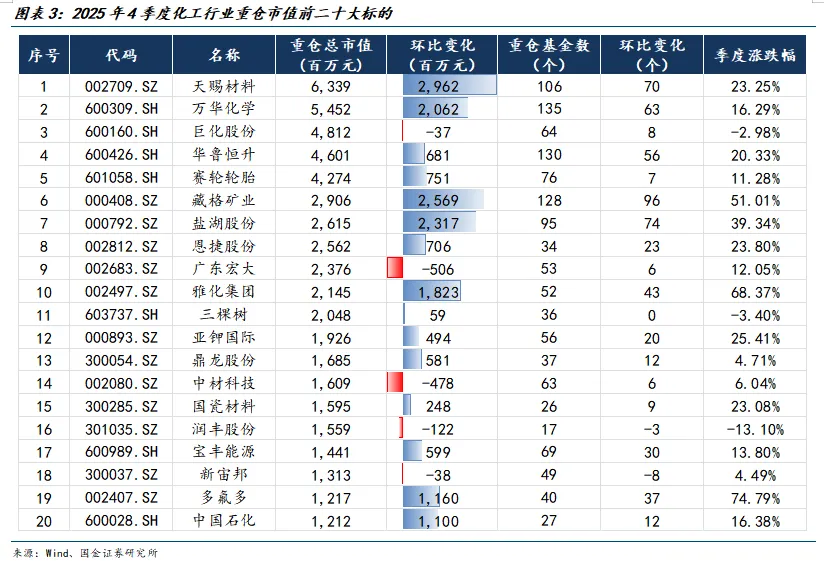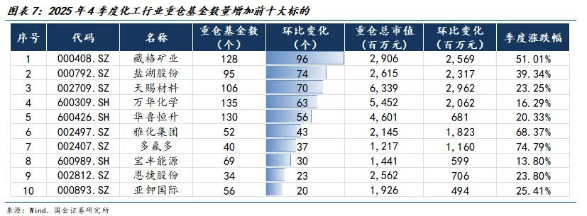 从基金持有数量看:公募基金持仓数量前十分别为万华化学(72增至135)、华鲁恒升(74增至130)、藏格矿业(32增至128)、天赐材料(36增至106)、盐湖股份(21增至95)、赛轮轮胎(69增至76)、宝丰能源(39增至69)、巨化股份(56增至64)、中材科技(57增至63)、亚钾国际(36增至56)。