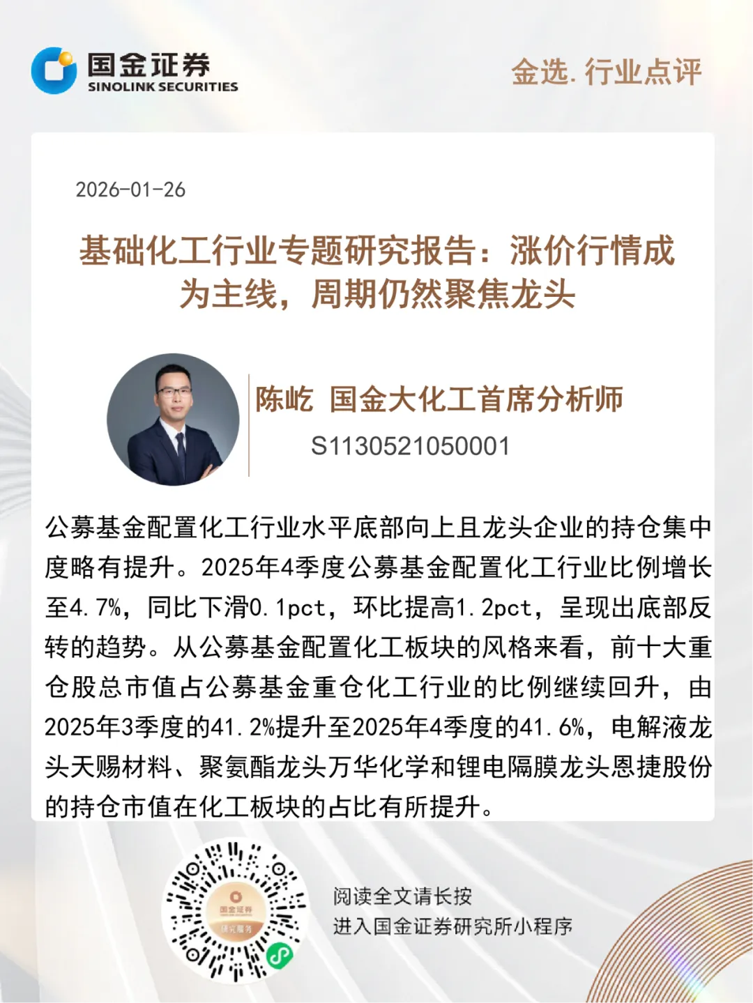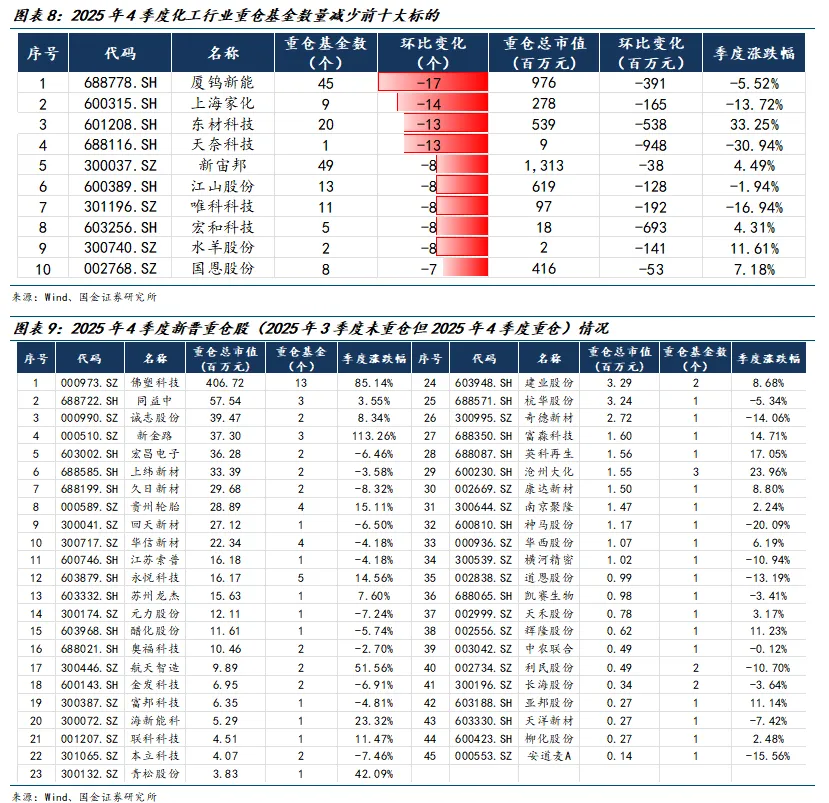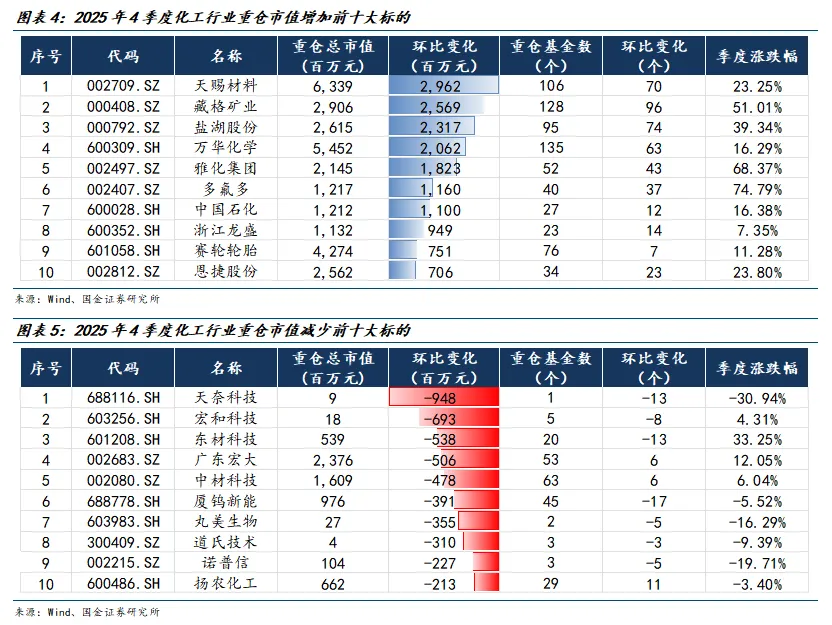 2025年4季度关注度主要集中在锂电材料、钾肥、聚氨酯和氟化工板块。从个股重仓市值来看:4季度获得加仓前五大标的是天赐材料、藏格矿业、盐湖股份、万华化学、雅化集团;减仓前五大标的是天奈科技、宏和科技、东材科技、广东宏大、中材科技。从基金持有数量看:持仓数量环比增加前五为藏格矿业、盐湖股份、天赐材料、万华化学、华鲁恒升。新晋重仓与退出重仓来看:新晋重仓标的方面,按2025年4季度重仓市值排序前五分别为佛塑科技、同益中、诚志股份、新金路、宏昌电子。退出重仓标的方面,按2025年4季度退出前的重仓市值排名靠前的标的分别为五矿新能、和远气体、震安科技、红太阳、华润材料。