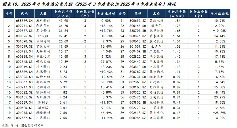 n 从个股退出重仓市值看,化工行业共有40个标的在2025年3季度重仓而在2025年4季度未重仓。从2025年4季度退出前的持仓市值来看,排名前五的分别为排名前五的分别为五矿新能(0.46亿元)、和远气体(0.35亿元)、震安科技(0.32亿元)、红太阳(0.27亿元)、华润材料(0.27亿元)。