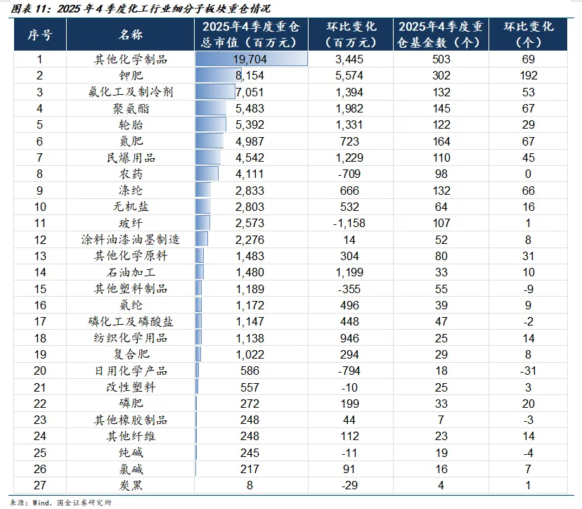 从各板块基金持仓市值来看,2025年4季度基金持仓市值排名前五大板块为其他化学制品(197亿元)、钾肥(81.5亿元)、氟化工及制冷剂(70.5亿元)、聚氨酯(54.8亿元)、轮胎(53.9亿元)。