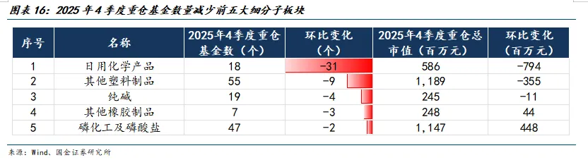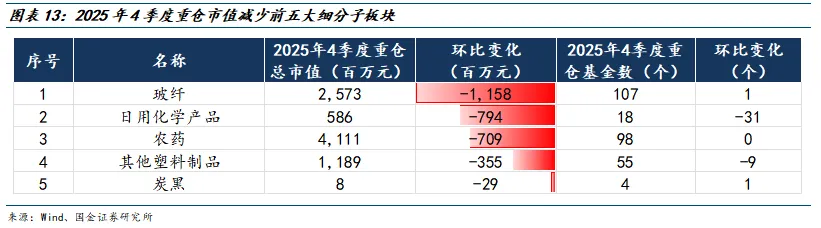减仓前五大子板块为:玻纤(37.3亿元减至25.7亿元)、日用化学产品(13.8亿元减至5.9亿元)、农药(48.2亿元减至41.1亿元)、其他塑料制品(15.5亿元减至11.9亿元)、炭黑(0.4亿元减至0.1亿元)。