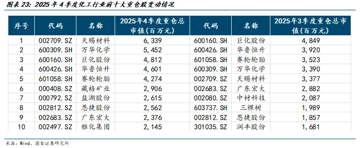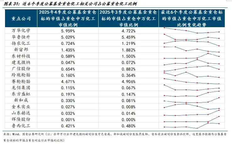 选取我们关注的万华化学、华鲁恒升、扬农化工、新宙邦、东材科技、建龙微纳、广信股份、玲珑轮胎、赛轮轮胎、龙佰集团、东方盛虹、新和成、金禾实业、山东赫达、辉隆股份、鲁西化工等16家相关公司,2025年4季度公募基金重仓的比例环比提升的公司有万华化学、龙佰集团、东方盛虹、新和成、金禾实业、山东赫达和辉隆股份;环比下滑的有华鲁恒升、扬农化工、新宙邦、东材科技、建龙微纳、广信股份、玲珑轮胎、赛轮轮胎和鲁西化工。