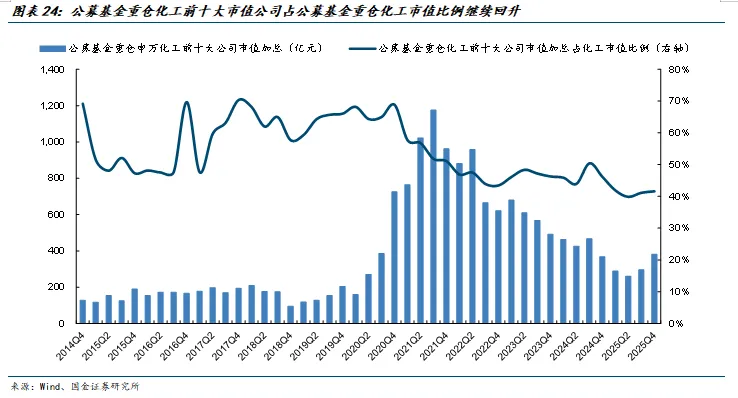 公募基金配置化工行业水平底部向上且龙头企业的持仓集中度略有提升。2025年4季度公募基金配置化工行业比例增长至4.7%,同比下滑0.1pct,环比提高1.2pct,呈现出底部反转的趋势。从公募基金配置化工板块的风格来看,前十大重仓股总市值占公募基金重仓化工行业的比例继续回升,由2025年3季度的41.2%提升至2025年4季度的41.6%,电解液龙头天赐材料、聚氨酯龙头万华化学和锂电隔膜龙头恩捷股份的持仓市值在化工板块的占比有所提升,4季度相比3季度的提升幅度分别为2.2pct、1.2pct、0.2pct。