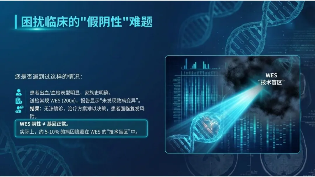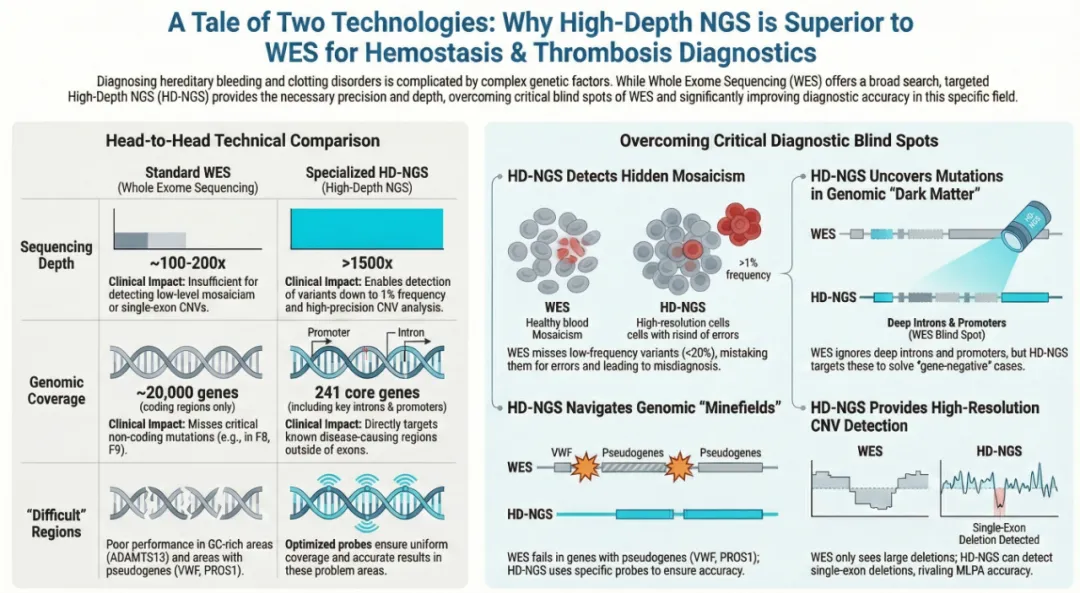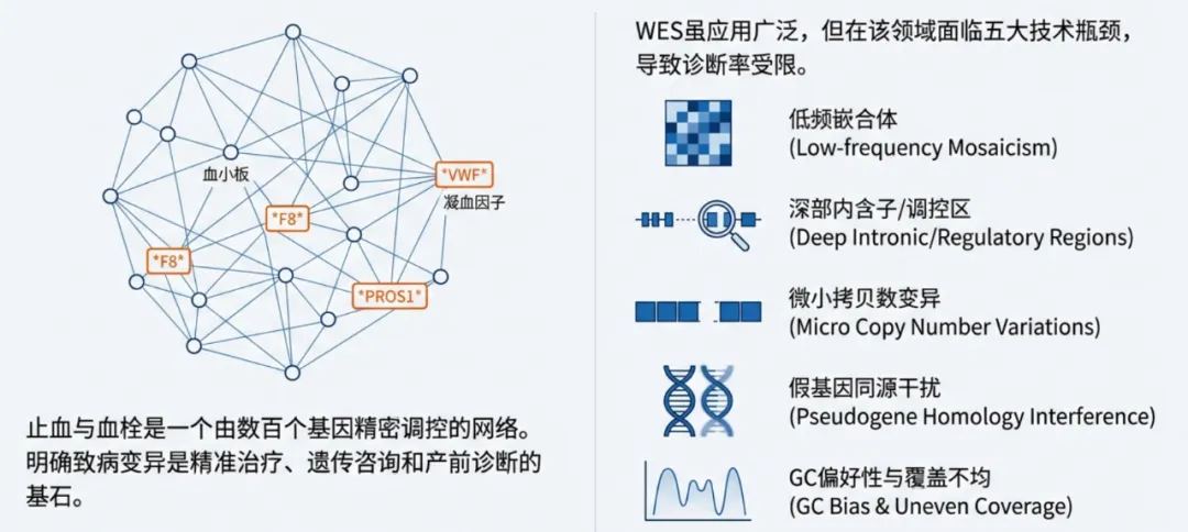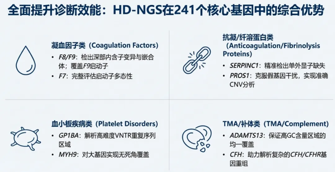 WES通常覆盖基因组中约1-2%的蛋白编码区,平均测序深度一般在100x-200x之间,被视为一种“广撒网”的策略,适用于表型复杂、致病基因不明的疑难杂症 3。然而,在血栓与止血这一特定垂直领域,致病基因相对明确,但其基因组结构却异常复杂——普遍存在假基因干扰(Pseudogenes)、高GC含量区域、复杂的拷贝数变异(CNV)、深部内含子变异(Deep Intronic Variants)以及体细胞/生殖细胞嵌合体(Mosaicism)实现复杂特定垂直领域,我们采用HD-NGS(如241个核心基因-出凝血全系统基因)突破在低频嵌合体、内含子致病位点、微小CNV及假基因同源区段检测中的技术瓶颈,从而显著提升临床诊断率。