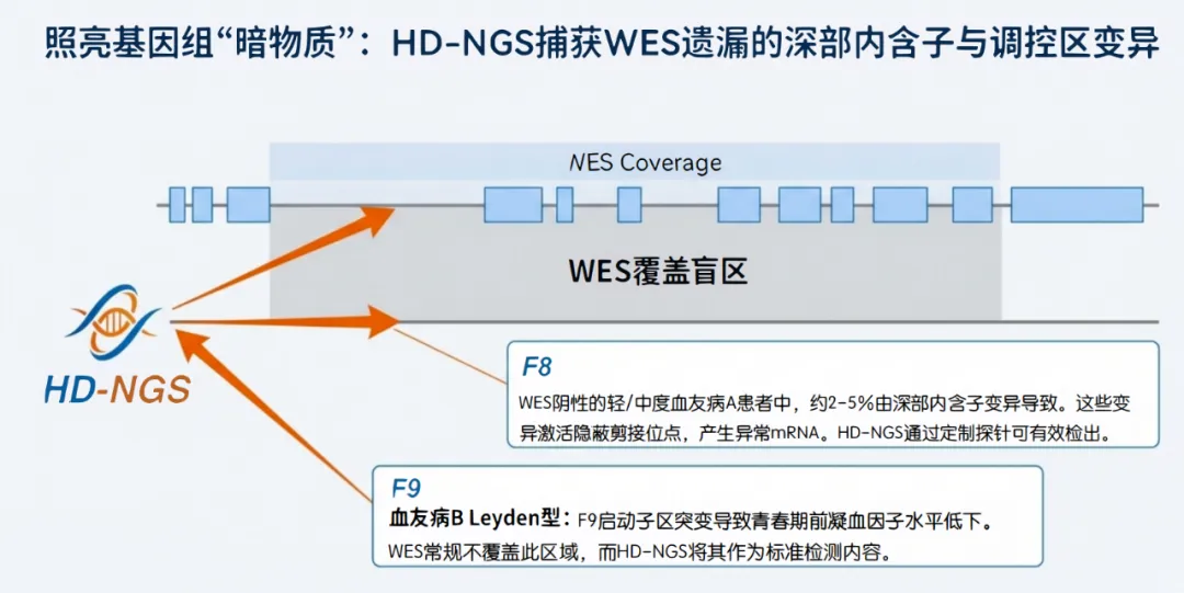 ●HD-NGS解决方案:针对F8的HD-NGS“平铺”探针覆盖关键内含子区域,或者针对已知的深部致病热点进行定点捕获。研究显示,在WES检测阴性的轻/中度血友病A患者中,通过全基因组或针对性内含子测序,可检出约2%-5%的病例为深部内含子变异所致 27。