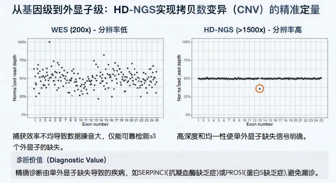 CNV(大片段缺失或重复)是SERPINC1、PROS1、F8等基因功能丧失的重要机制。WES在CNV检测上存在天然劣势,而HD-NGS通过高深度和均一性覆盖实现了CNV检测的“标准化”。