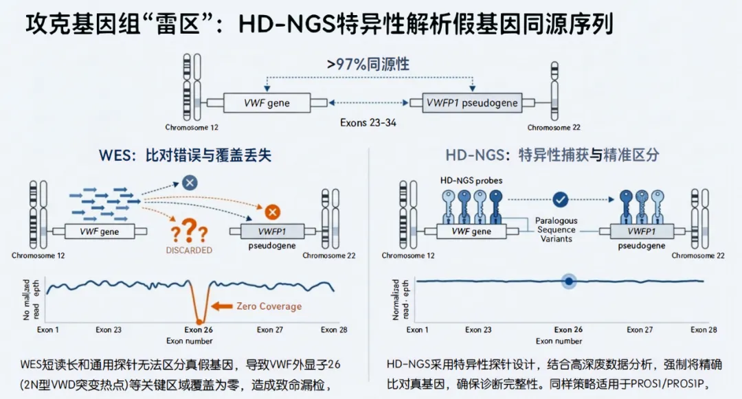 ●核心难题:VWF基因的外显子23-34与位于22号染色体上的假基因VWFP1具有高达97%的序列同源性。在WES数据中,源自VWF真基因的Reads常被错误比对到假基因上,或者因多重比对(Multi-mapping)被丢弃,导致外显子26等区域出现覆盖度极低甚至为零的现象(Drop-out)。外显子26是2N型VWD致病突变的热点区域,WES的这一缺陷是致命的 43。