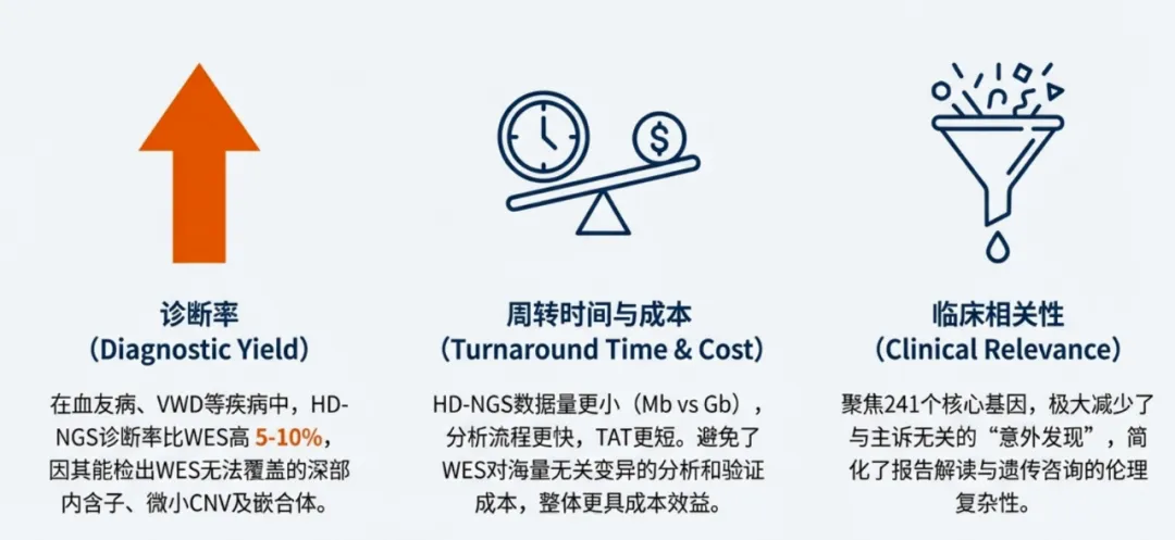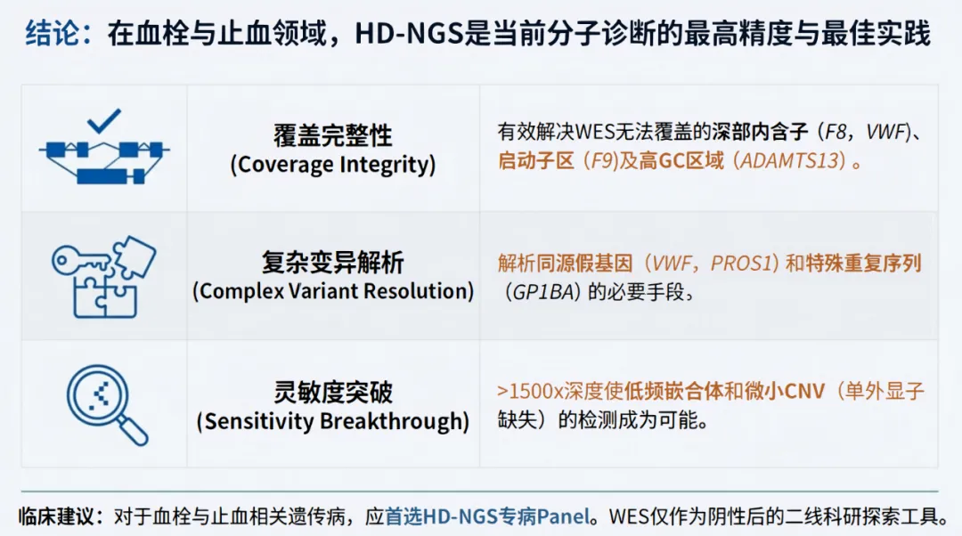 建议:对于临床怀疑患有血友病、VWD、血栓性疾病或血小板疾病的患者,首选基于HD-NGS的专病Panel进行检测。WES应仅作为HD-NGS检测阴性后,为了寻找未知新致病基因的二线科研性检测手段。对于241个明确关联的基因,HD-NGS代表了当前分子诊断的最精度与最佳实践。