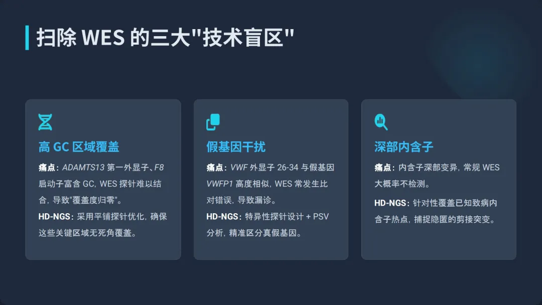 假基因分辨 | 差,依赖比对算法,易错配 | 强,结合特异性探针 | 解决VWFexon26、 PROS1等假基因干扰。 |