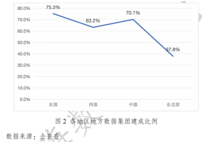 从各区域地方数据集团建设情况看,东部地区地方数据集团建成的比例最高,达到 75.3%;中部地区其次,达到 70.1%,东北部地区最低,仅为 37.8%,表现出各地区数据集团建设的进度并不一致。