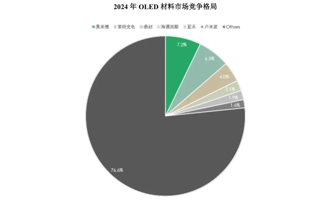 根据CINNO Research 统计,截至2024 年底,国内共计有奥来德、莱特光电、鼎材科技、海谱润斯、夏禾科技、卢米蓝共计 6 家公司实现了OLED 有机发光材料的量产和销售,此外也有一批如三月科技等企业也不同程度实现了小批量的有机发光材料生产。国内OLED 有机发光材料企业排名和市占率如下图所示,鼎材科技OLED 发光材料市场份额排名第三,表现较为突出,2024年国内市场占比达4.0%。其他公司在 2024 年营收均未过亿。