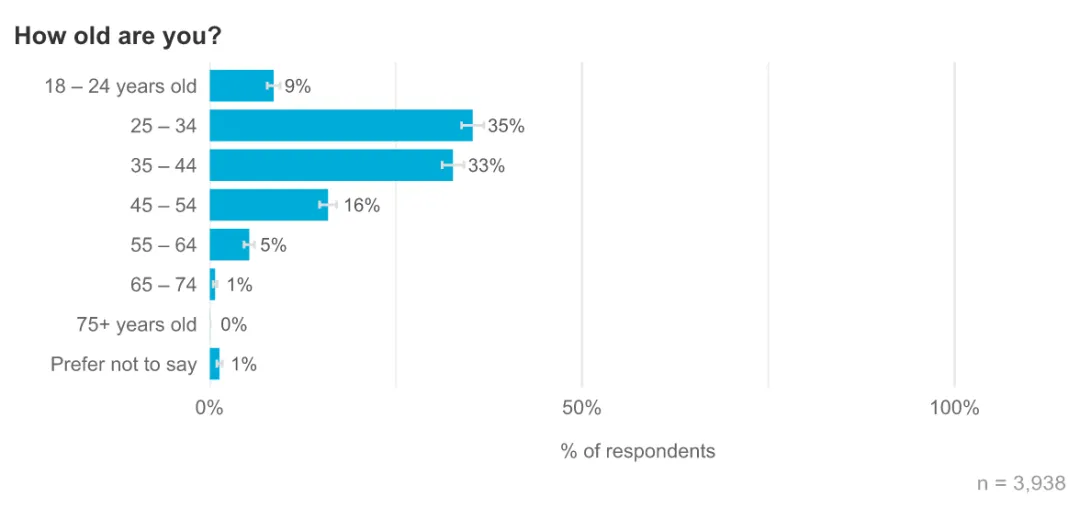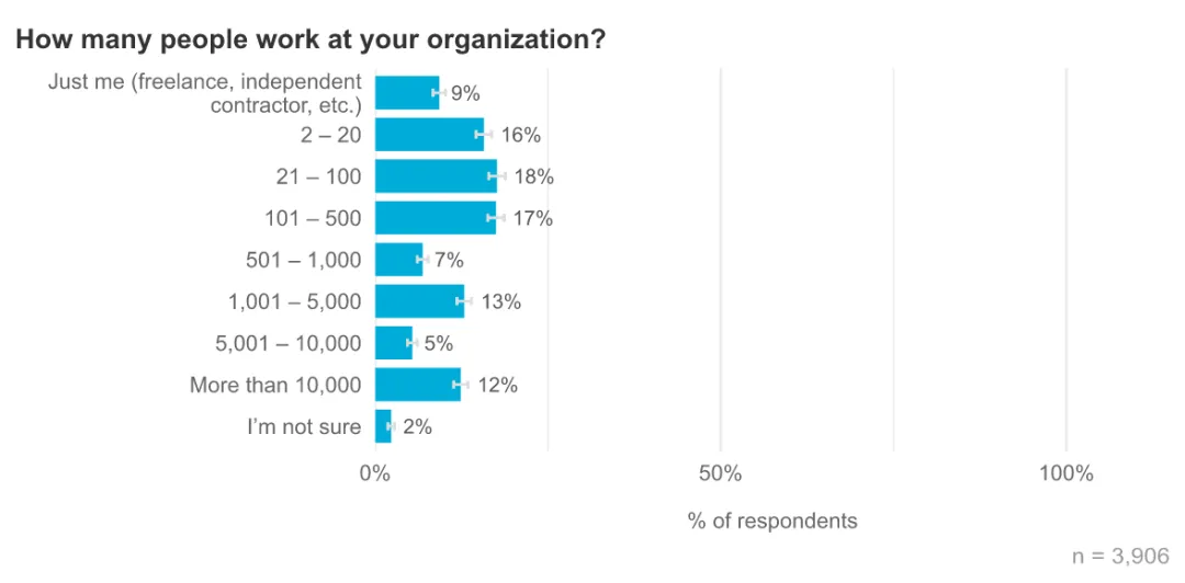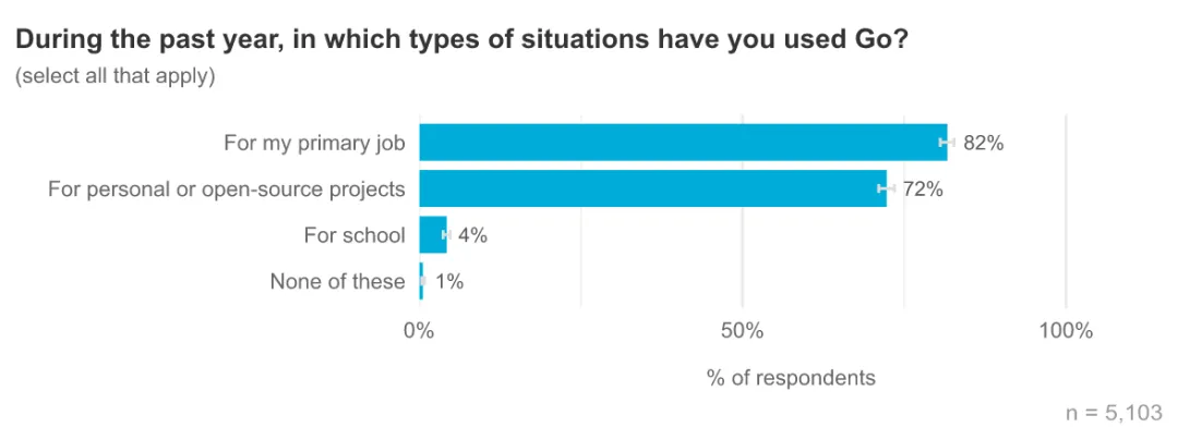 本报告通过调研响应图表为结论提供支撑。所有图表采用统一格式:标题即为受访者看到的原始问题。除非另有说明,问题均为单选;图表副标题会注明该题是否为多选或开放式文本框。对于开放式文本回复,由 Go 团队成员进行人工阅读和分类。由于开放式问题答案多样,为控制图表尺寸,我们将回复归纳为前 10-12 个主题,其余归入“其他”。图表中的百分比标签取整显示(例如 1.4% 和 0.8% 均显示为 1%),但条形长度和排列顺序基于未取整的原始数值。