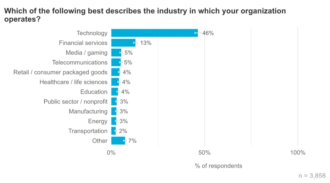 在行业分布上,“技术”行业占比最高(46%),但仍有超过半数(54%)的受访者在非技术行业工作。组织规模方面分布均匀:51% 的受访者就职于 2 - 500 人规模的公司,9% 为独立开发者,30% 则效力于千人以上的大型企业。地理分布上,大部分反馈依然来自北美和欧洲地区。