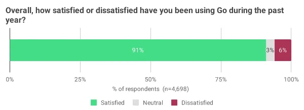 绝大多数受访者(91%)表示对使用 Go 语言感到满意。其中近 2/3 的人选择了“非常满意”,这是最高级别的评价。这两项指标都非常积极,且自 2019 年开始调研以来一直保持稳定。我们长期关注这一指标的稳定性,并将其视为一种滞后指标——这意味着,如果满意度发生显著变化,我们通常已经能从问题报告、邮件列表或其他社区反馈中察觉到早期信号。
