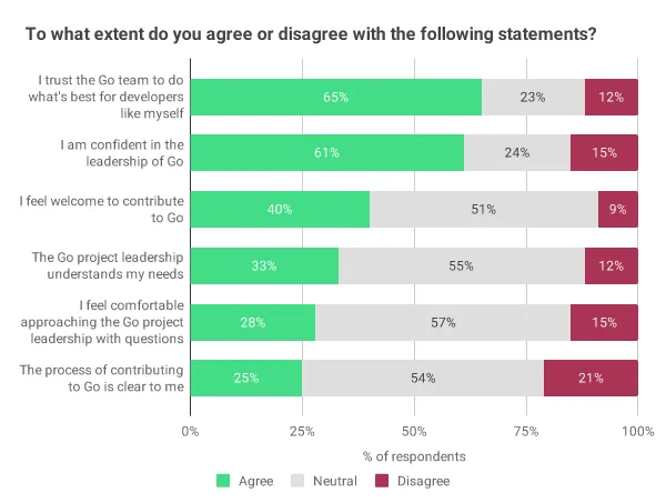 今年我们还调研了社区对 Go 项目本身的看法。结果与上述 91% 的满意度有所不同,这指出了 Go 团队在 2026 年计划投入精力的方向。具体而言,我们希望鼓励更多贡献者参与进来,并确保团队能够准确理解开发者当前面临的挑战。我们希望通过这些努力,进一步提升开发者对 Go 项目及领导层的信任。正如一位受访者所言: