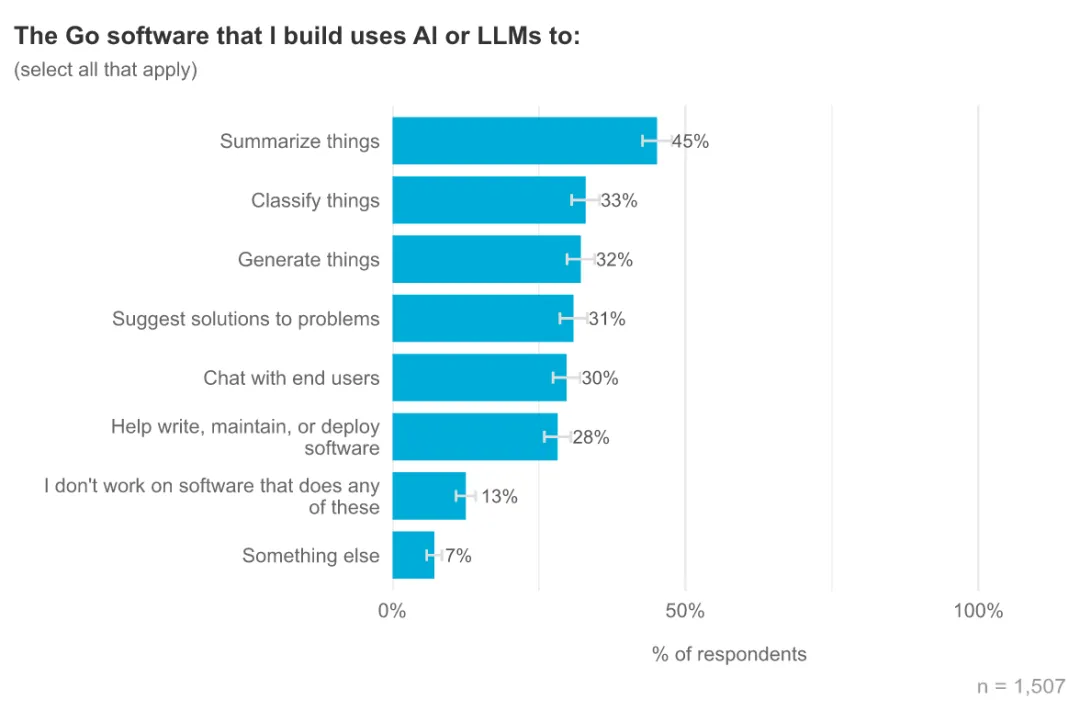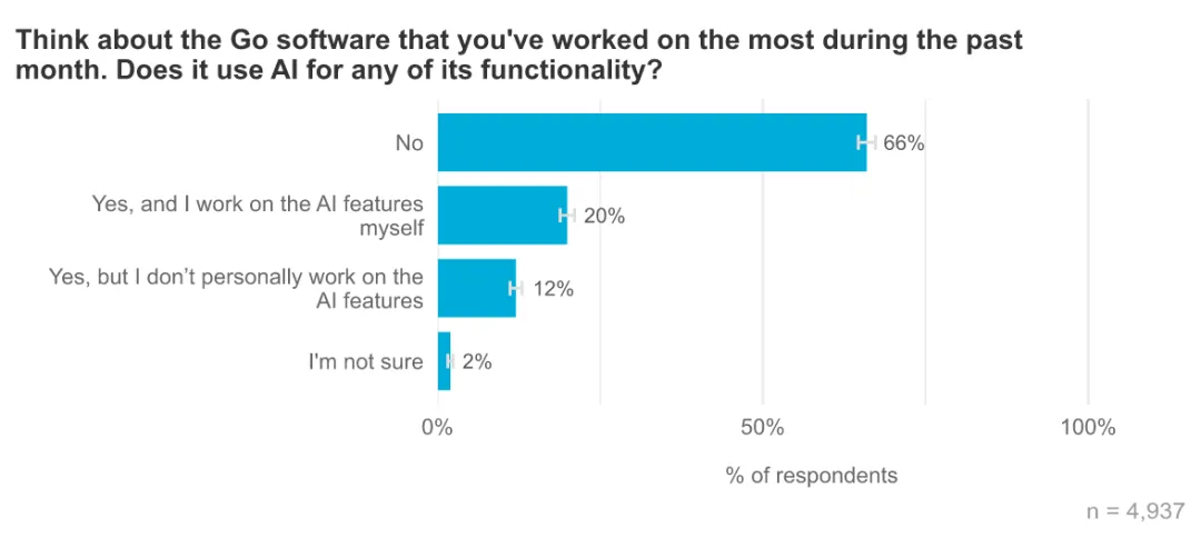 大多数受访者表示目前并未在 Go 软件中构建 AI 驱动的功能 (78%),其中 2/3 的受访者表示其软件完全不涉及 AI 功能 (66%)。与去年相比,生产环境中的 AI 采用率似乎有所下降:2024 年有 59% 的受访者未参与 AI 功能开发,而 39% 表示有不同程度的参与。今年这一比例下降了 14 个百分点,这可能反映出市场对 AI 炒作的自然回落:很多人在技术发布初期进行了尝试,但随后有一部分人决定暂缓进一步探索。