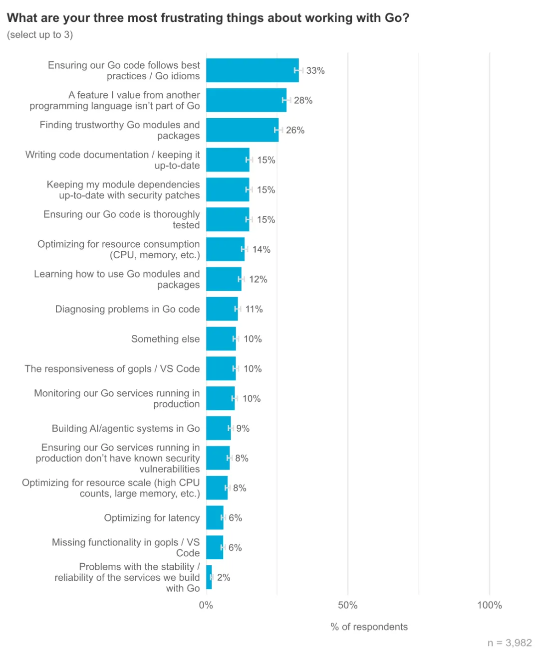 今年的调研显示,排名前三的痛点分别是:“确保代码符合最佳实践/地道用法(Idiomatic Go)”(33%)、“缺失其他语言中的优秀特性”(28%)以及“寻找可靠的 Go 模块与包”(26%)。