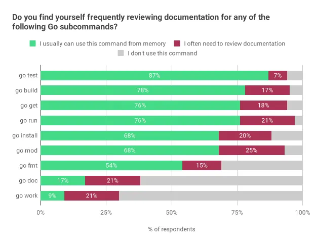 - 调研显示,高频查阅 go build、go run 和 go mod 等核心子命令文档的受访者比例惊人。这表明 go 命令的内置帮助系统仍有巨大的改进空间。