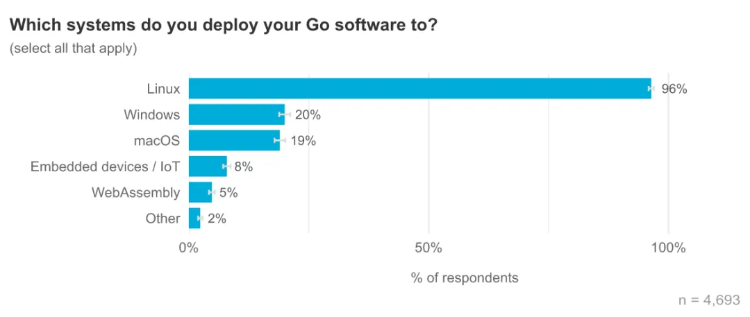 调研结果显示,受访者的开发平台普遍具有类 UNIX 特性。大多数开发者在 macOS (60%) 或 Linux (58%) 上进行开发,并将其部署到 Linux 系统(包括容器,占比达 96%)。同比变化最明显的是“嵌入式设备 / IoT”部署,占比从 2% 增长至 8%,这也是自 2024 年以来部署平台方面唯一显著的变化。