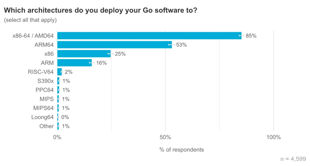 绝大多数受访者在 x86-64 或 ARM64 架构上进行开发,仍有相当一部分群体 (25%) 可能在 32 位 x86 系统上工作。