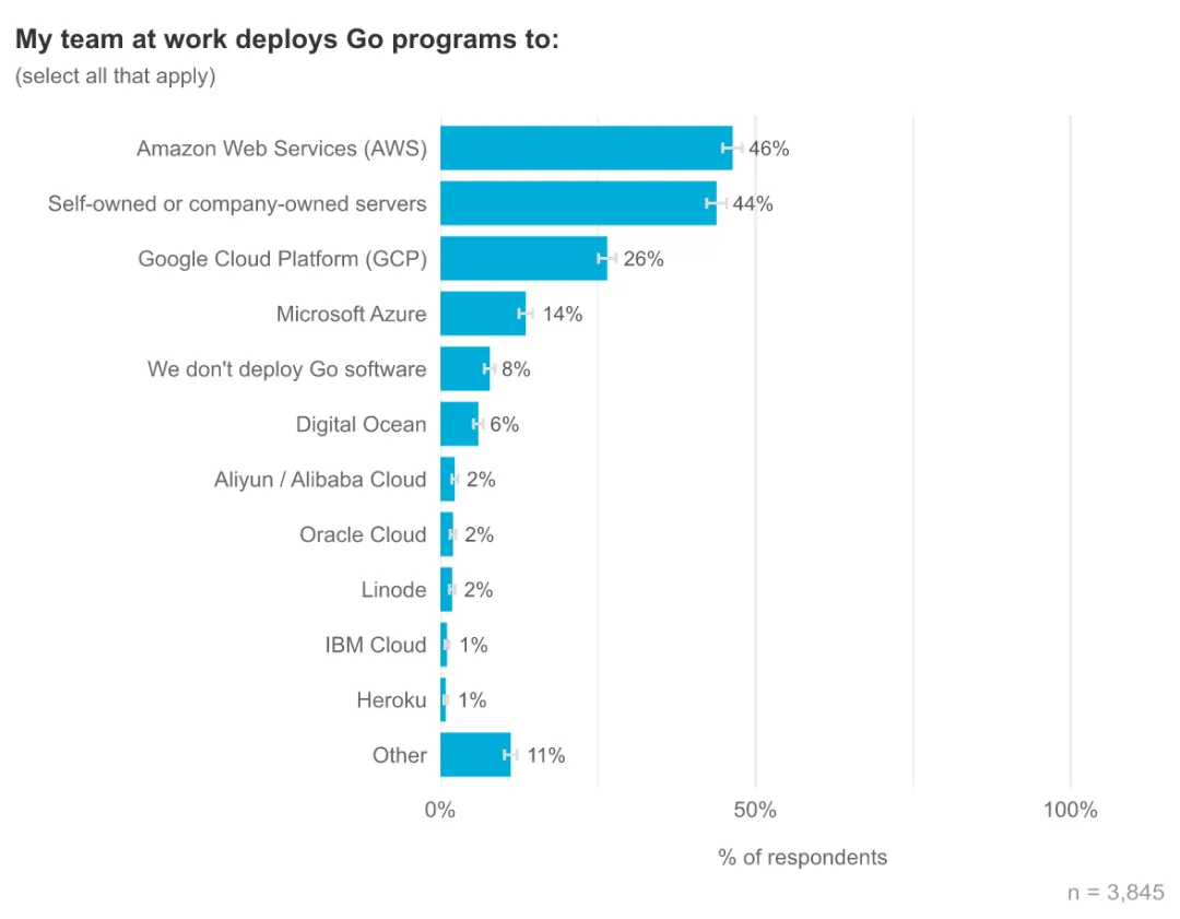 Go 最常见的部署环境依然是 Amazon Web Services (AWS) (46%)、公司自建服务器 (44%) 以及 Google Cloud Platform (GCP) (26%)。与 2024 年相比,这些数据波动较小。值得注意的是,“其他”类别今年上升至 11%,主要由 Hetzner 驱动(占“其他”响应的 20%)。