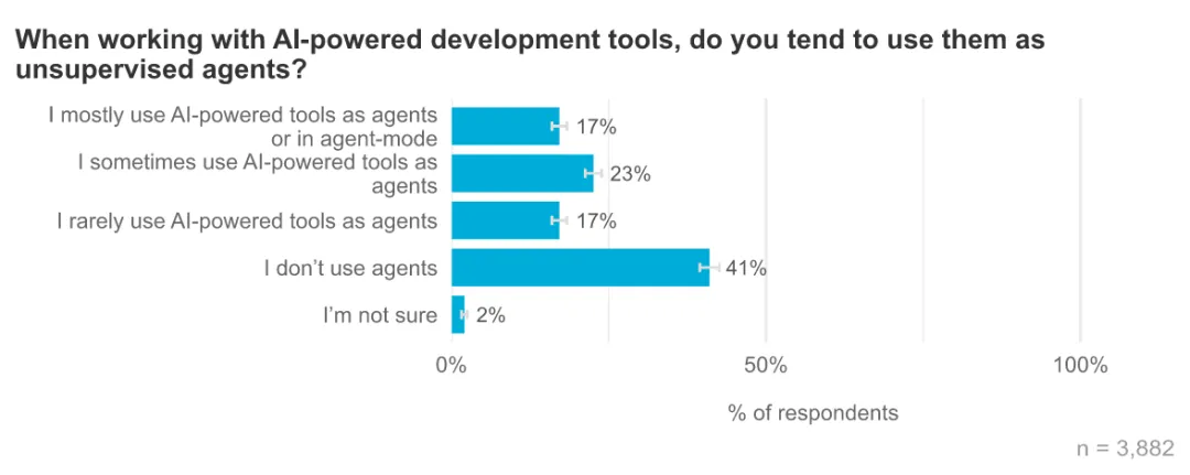 目前,Go 开发者对 AI Agent(智能体)的使用尚处于起步阶段。仅有 17% 的受访者将其作为主要使用方式,不过有较大比例(40%)的开发者正在偶尔尝试 Agent 模式。