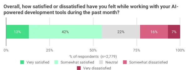 “在处理中大型代码库(1 万行代码以上)时,所有 AI 工具都很容易出现幻觉。它们解释代码很有效,但在生成新的复杂功能时非常吃力。” —— 比较满意 / 3 - 10 年经验 / 零售与消费品业