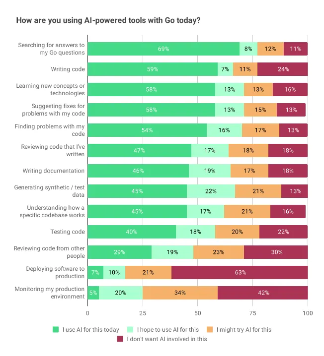 - 大多数 Go 开发者已开始在信息检索(如学习模块用法)和处理重复性劳动(如编写样板代码)时使用 AI 辅助开发工具。然而,受限于生成质量等问题,开发者对这些工具的满意度目前处于中等水平。