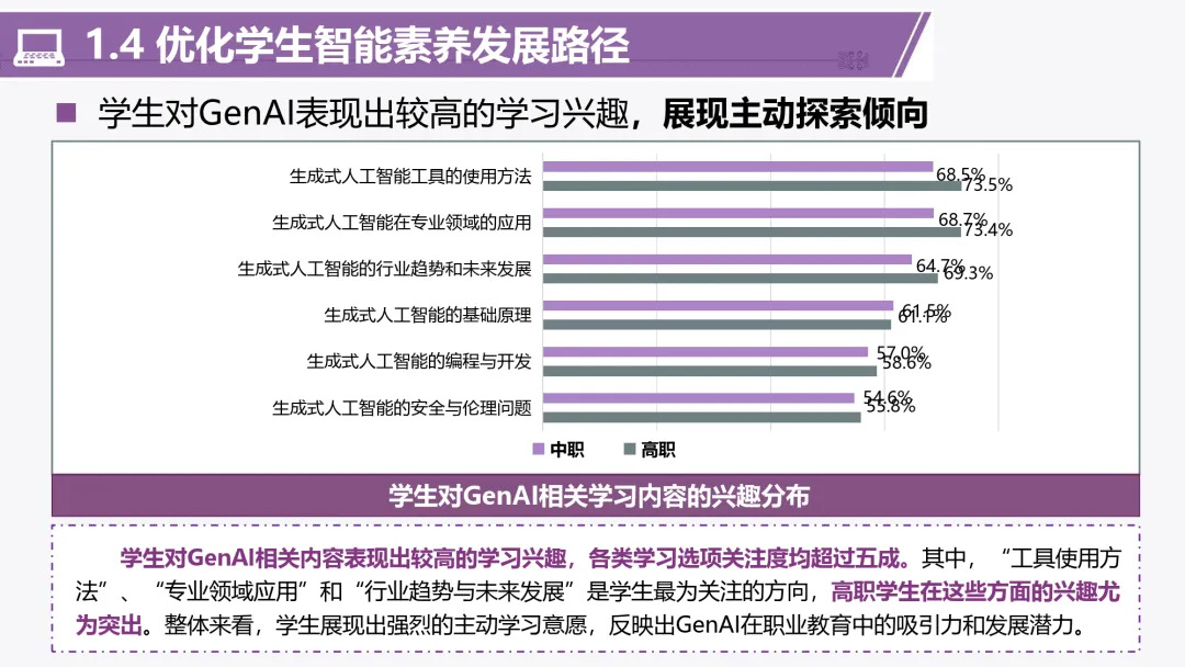 报告核心围绕师生智能素养发展、AI 创新人才培养、产教深度融合、智慧校园升级、伦理安全保障等八大板块展开。师生层面,学生广泛使用 GenAI 进行知识拓展、职业规划等,高职学生使用率高于中职,但双方在创新能力与伦理意识上均有短板;教师智能教学素养整体达标,高职优于中职,东部地区领先西部,但高阶应用能力不足。