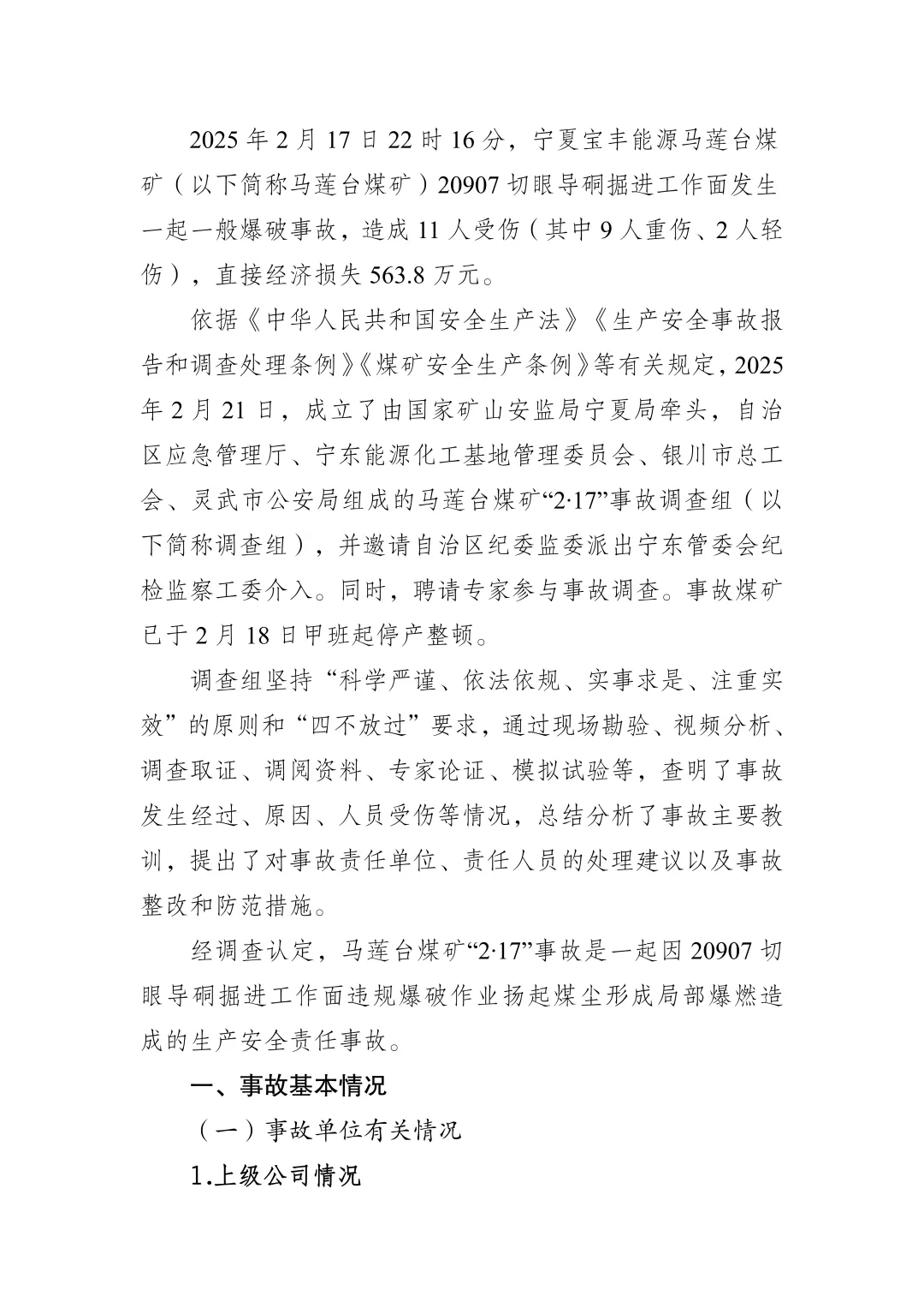 2025年2月17日22时16分,宁夏宝丰能源马莲台煤矿(以下简称马莲台煤矿)20907切眼导硐掘进工作面发生一起一般爆破事故,造成11人受伤(其中9人重伤、2人轻伤),直接经济损失563.8万元。