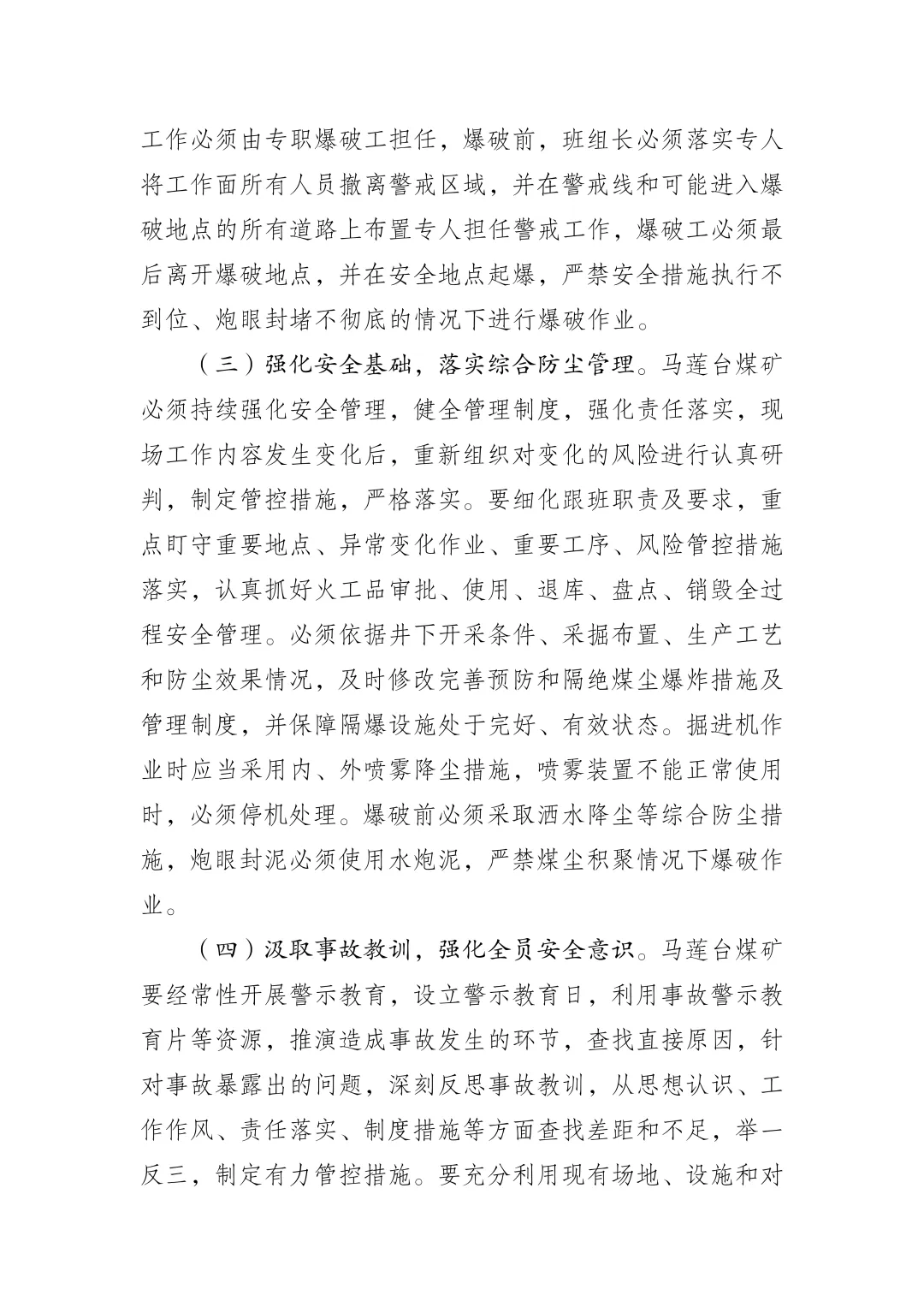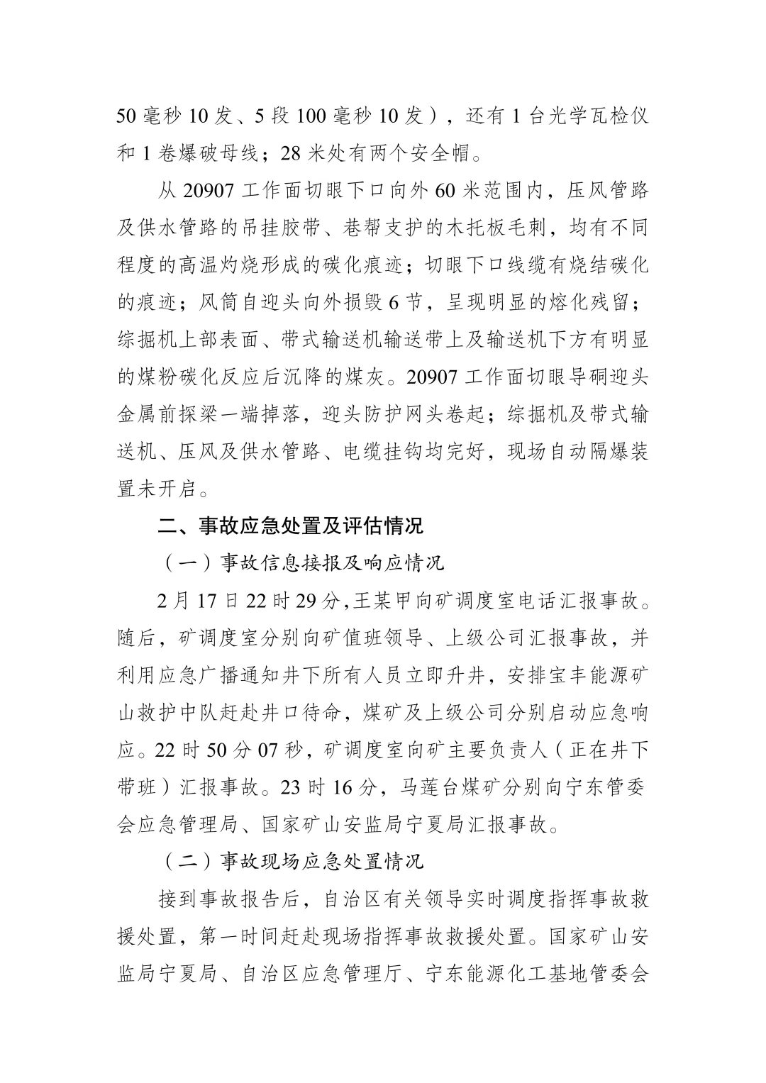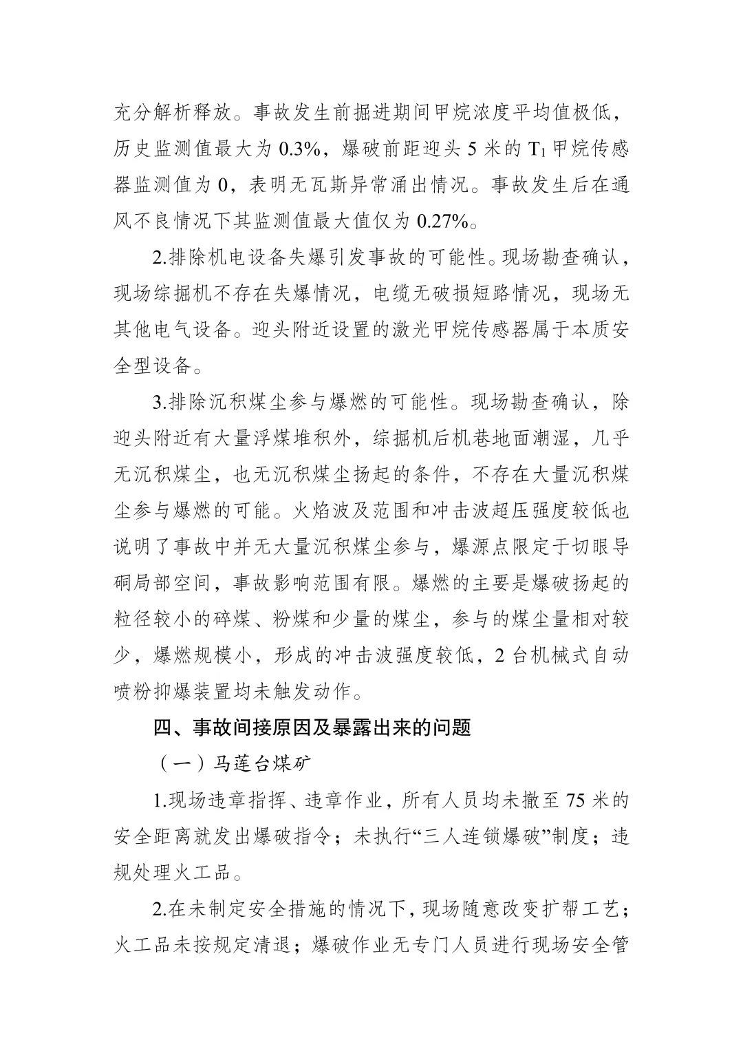 经调查认定,马莲台煤矿“2·17”事故是一起因20907切眼导硐掘进工作面违规爆破作业扬起煤尘形成局部爆燃造成的生产安全责任事故。