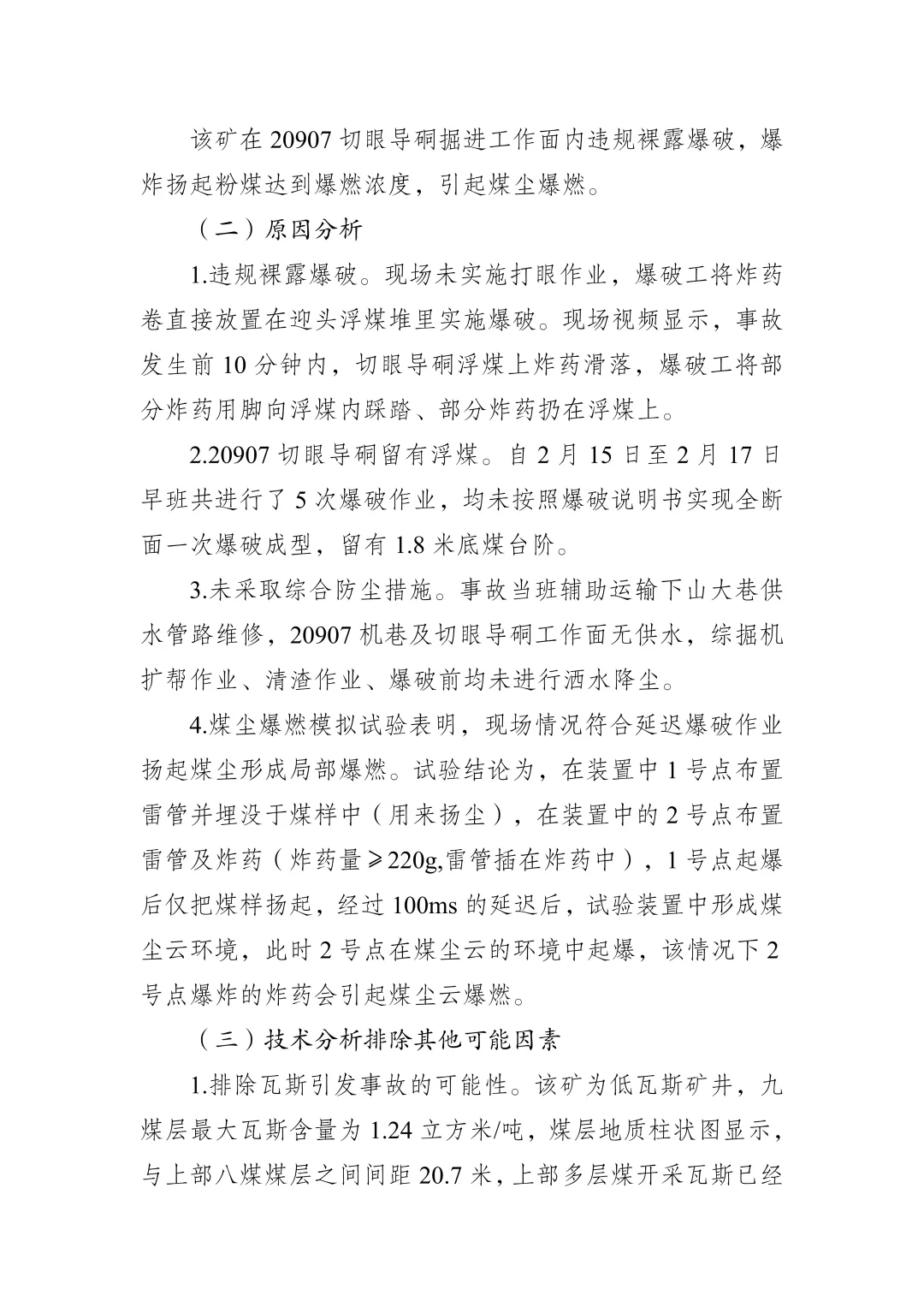 该矿在20907切眼导硐掘进工作面内违规裸露爆破,爆炸扬起粉煤达到爆燃浓度,引起煤尘爆燃,是事故的直接原因。