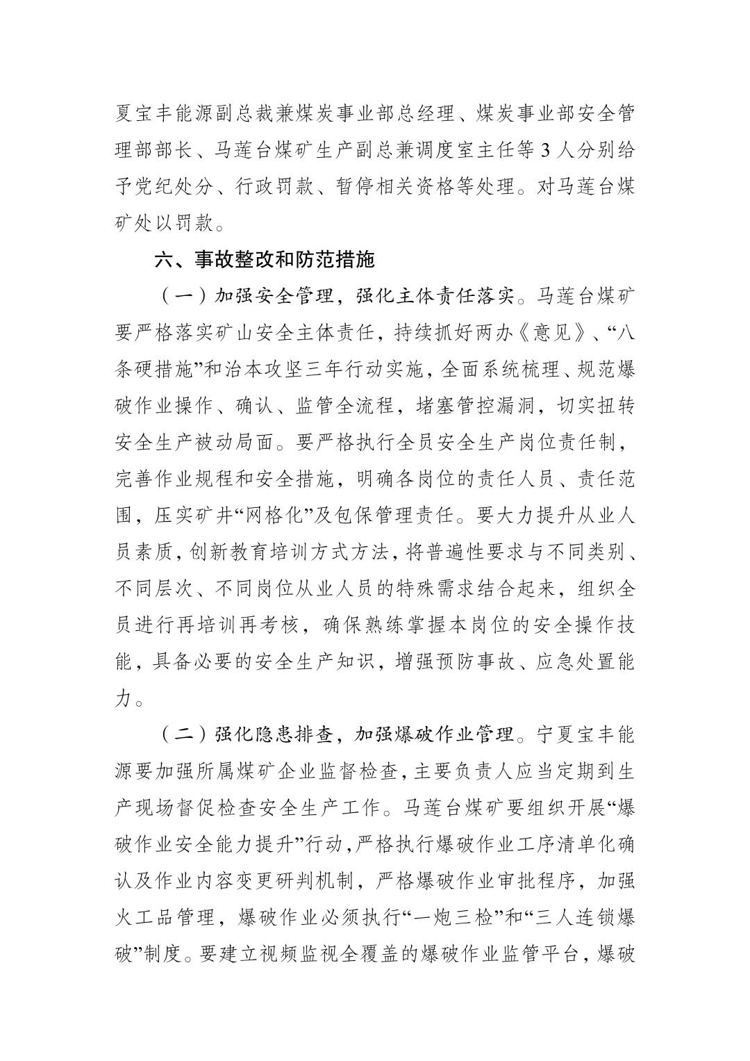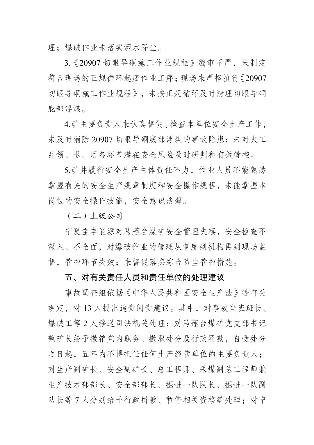 事故调查组依据《中华人民共和国安全生产法》等有关规定,对13人提出追责问责建议。其中,对事故当班班长、爆破工等2人移送司法机关处理;对马莲台煤矿党支部书记兼矿长给予撤销党内职务、撤职处分及行政罚款,自受处分之日起,五年内不得担任任何生产经营单位的主要负责人;对生产副矿长、安全副矿长、总工程师、采煤副总工程师兼生产技术部部长、安全部部长、掘进一队队长、掘进一队副队长等7人分别给予行政罚款、暂停相关资格等处理;对宁夏宝丰能源副总裁兼煤炭事业部总经理、煤炭事业部安全管理部部长、马莲台煤矿生产副总兼调度室主任等3人分别给予党纪处分、行政罚款、暂停相关资格等处理。对马莲台煤矿处以罚款。